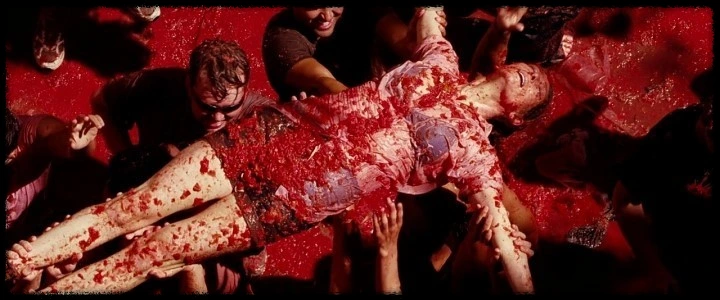 에바의 토마토 축제와 케빈의 화살 테러 장면은 교묘하게 혼재되어 있다.