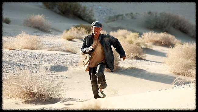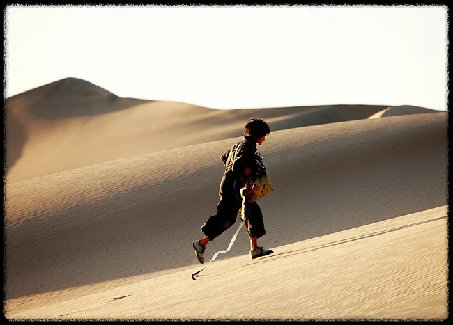 한 남자(장역)가 사막을 걷는다. 모래바람이 부는 사막의 풍광은 아름답지만 언덕배기 사막을 오르내리며 온몸으로 모래 바람을 맞는 남자는 애처롭다. 남자의 걸음은 매끄러운 모래 위를 꾹꾹 누르지만 책장을 넘기듯 불어오는 바람에 발자국은 흔적도 없이 사라진다. 영화를 보러 가는 길이다. 아니 정확히는 영화 시작 전에 방영하는 뉴스를 보려는 것이다. 그 뉴스의 한 장면에 딸이 나온다는 얘기를 들었기 때문이다. 힘겹게 도착한 곳에는 이미 영화가 끝났고 다음 상영지로 필름을 배송하려고 모든 짐 정리를 끝낸 상태다. 어쩔 수 없이 남자는 다음 상영지로 걸음을 옮긴다.