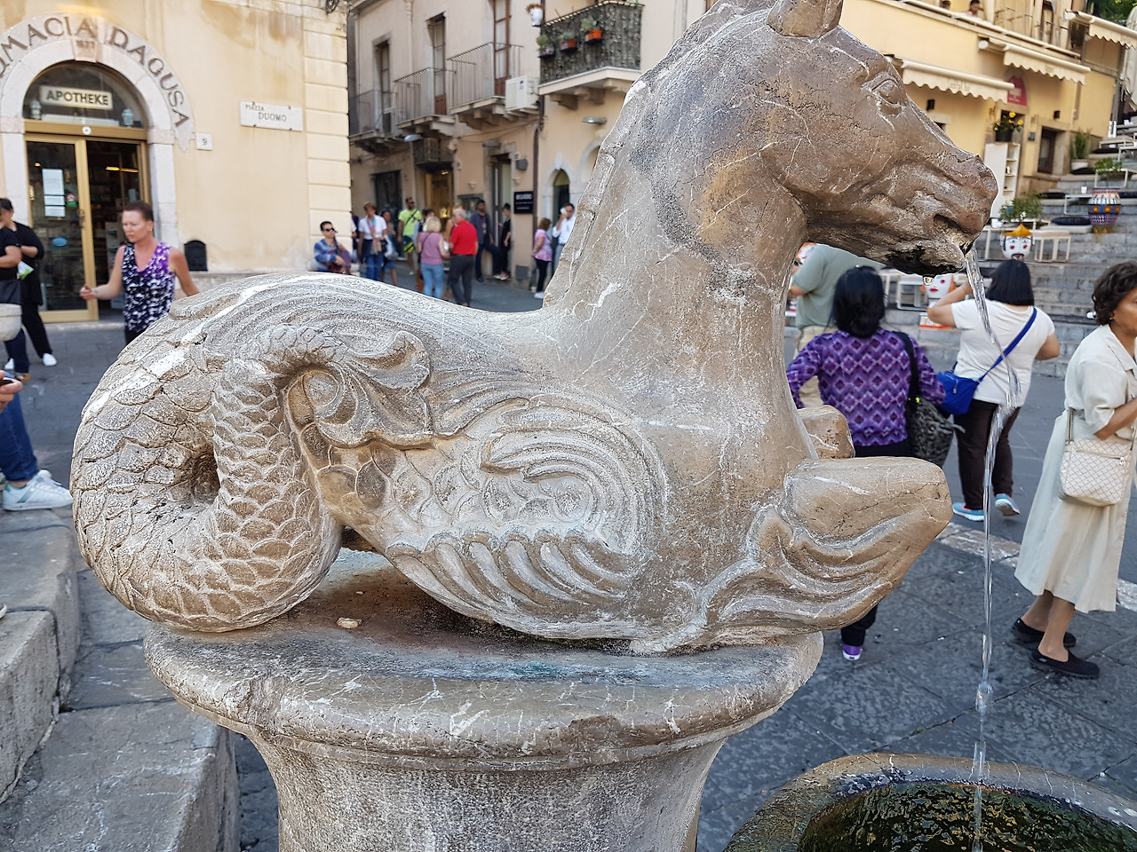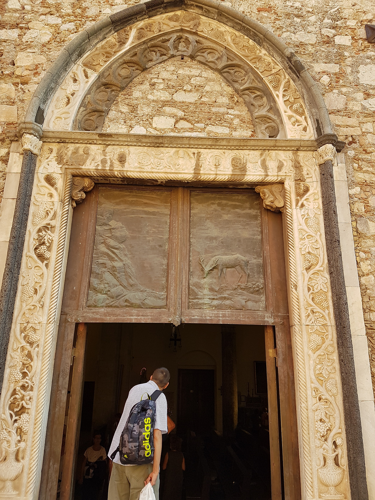 움페르토 1세의 거리 끝에 카타니아의 대문이 있었다. 그 쪽으로 걸어가 왼쪽에 있는 대성당을 방문했다. 그리 크지 않은 성당이었지만 볼것은 많았다. 성당은 ‘두오모 광장(Piazza del Duomo)’에 있었고 13세기에 완성됐다고 하니 거의 700년의 역사를 가지고 있었다. 가까이엔 성당과 같이 오랜 역사를 자랑하는 바로크식 분수가 있었다. 이 성당은 ‘바리의 니콜라스 성인(Saint Nicholas of Bari)’에 봉헌되었는데 이태리 동쪽 연안의 ‘바리(Bari)’는 '파드레 비오' 성인의 ‘산 죠반니 로톤도’에서 그리 멀리않은 아드리아해에 면한 항구 도시이다. 우리가 잘 아는 크리스마스의 ‘산타 클라우스’의 원 이름 ‘세인트 니콜라스’가 ‘산타 클라우스’로 변한 것이다. 바리의 대성당에 이 니콜라스 성인의 유물이 아직도 있다고 한다. 산타 클라우스의 이름을 지닌 타오르미나의 이 대성당은 겉보기에 참으로 견고하게 지어졌다. 그래서 꼭 성채처럼 보이기도 했다. 외세의 침입이 잦아 그러했으리라. 그러나 성당안은 고딕원형으로 잘 보존되어 있었고 심지어는 장미창(장미꽃 모양의 스테인드그라스. 고딕 성당의 대표적 심볼. a rose window)도 아름답게 서쪽 벽 끝에 있었다.