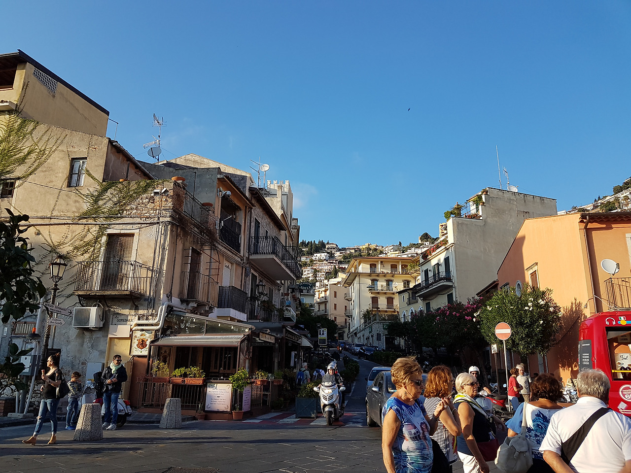 일자로 뻗은 거리의 양편으로 시칠리아 특유의 아기자기한 가게들과 레스토랑 그리고 바(bars)와 카페(Cafes)들이 옹기종기 모여있었다. ‘코르소 움베르토 1세(Corso Umberoto I)’라 이름붙은 이 일자형 거리는 타오르미나의 중심이며 대부분의 볼것들이 여기 다 모여있었다. 각 가게마다 특유한 데코레이션을 경쟁하며 건물들도 일률적이 아닌 각자의 개성들을 뽐내고 있었다. 그 중에서도 난 시칠리아식 베란다가 있는 건물이 좋았다. 가이드 말에 의하면 명품을 파는 가게들도 많이 있어 파리와 밀라노에 뒤지지(?) 않는다고 했고 관광객을 유혹한다고 했다. 내 눈에는 뭐가 명품인지 뭐가 싸구려인지 구별이 안갔다. 그러나 무엇보다 진한 시칠리아의 명품 커피만은 마시고 싶었다.