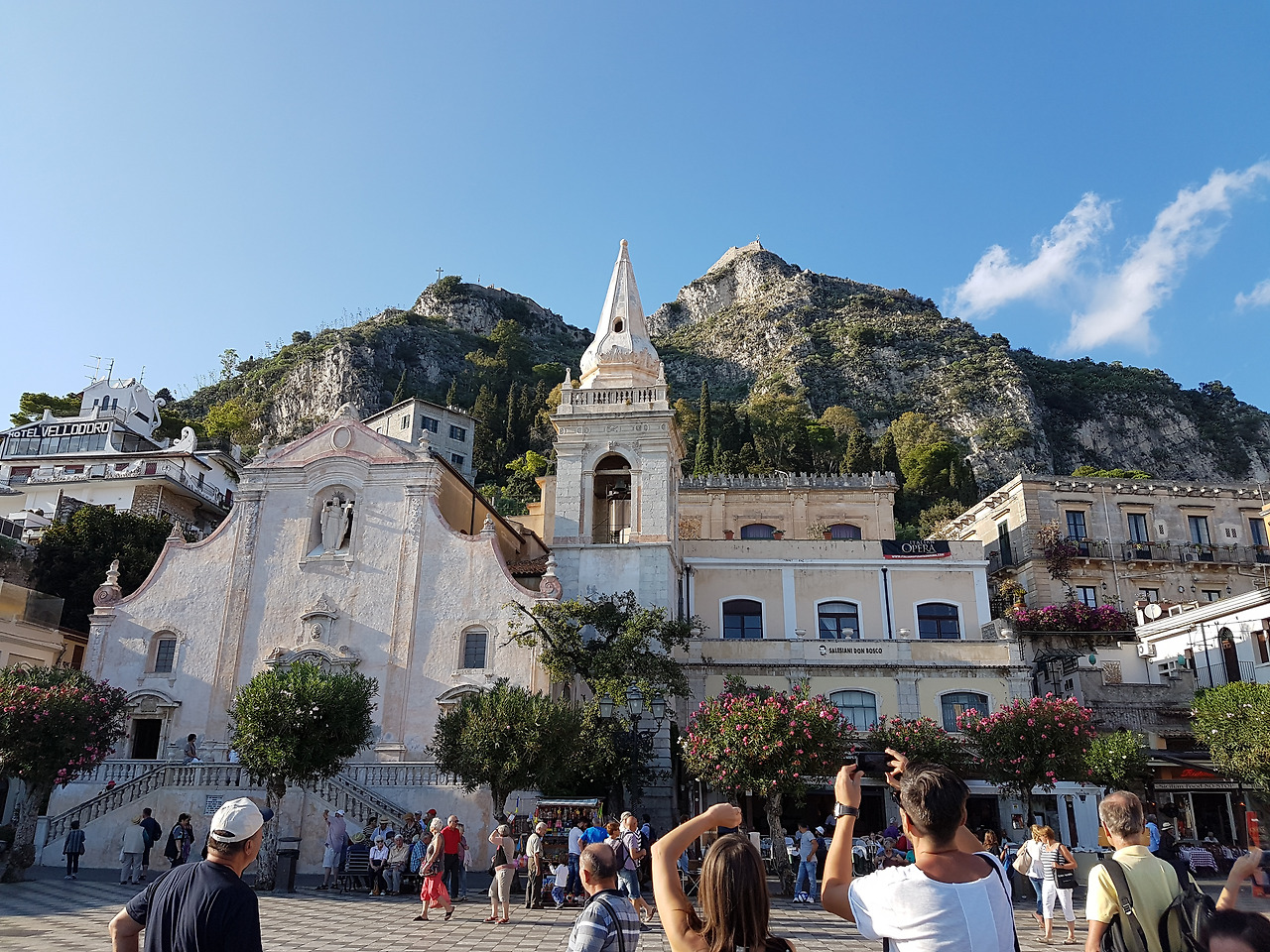 타오르미나의 중심광장. 중세의 성당이 가운데 보인다. 뒤돌아 보면 깍아지른 듯한 절벽과 그 아래로 푸른 이오니아 해가 바로 보인다.