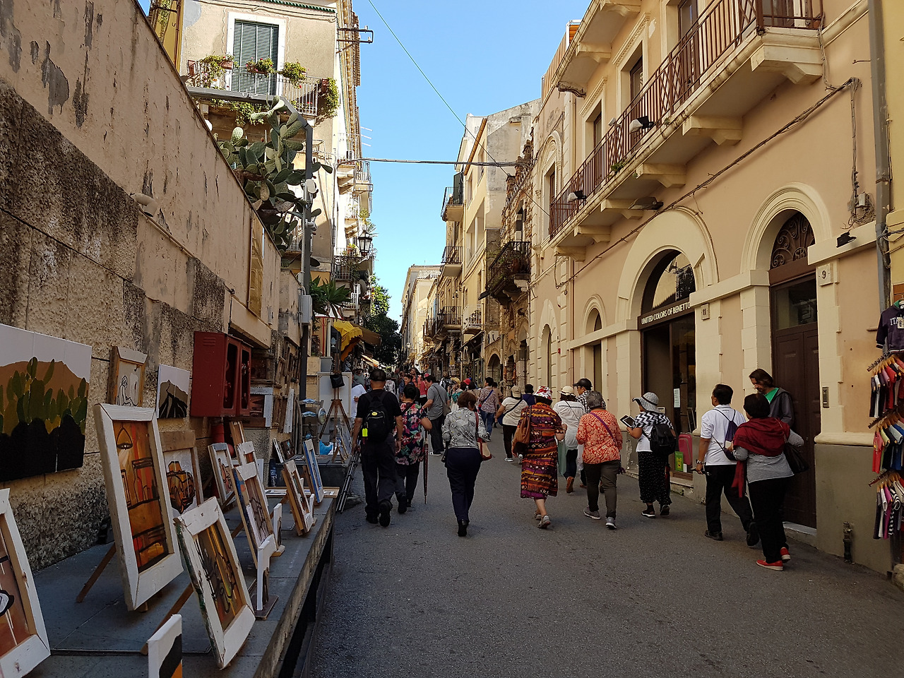 타오르미나의 거리. 길거리에서 그림을 파는 게 보인다. 누구라도 타오르미나 한폭을 가져가고 싶어한다.