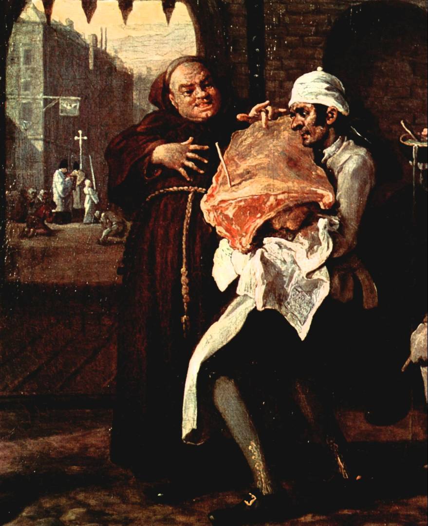 이 쇠고기와 똑같은 선상에 피골이 상접한 프랑스 군인이 도개교(drawbridge. 부산 영도다리와 같은), 칼레 대문앞 바로 양쪽에 위치하고 있다. 이 그림이 풍자적인 걸 쉽게 읽을 수 있는 것 중의 하나가 큰 쇠고기 덩어리와 바로 대비되도록(비슷한) 중앙의 뚱뚱한 가톨릭 ‘프란치스코’회 수도사의 모습이다. 이 배가 퉁실하게 나온 수도사는 그림속 프랑스 사람들 중 오직 뚱뚱한 사람이다. 나머지는 피골이 상접한 프랑스인들이고 그 중 한명은 스코틀랜드인이다. 이 수도사는 이럼에도 영국 쇠고기가 얼마나 군침이 도는지 침을 흘리며(?) 손가락으로 살짝 찔러보고 있다. 한마디로 '탐욕'을 보여준다. 얼마나 종교, 특히 당시 영국 성공회에 비해 프랑스의 가톨릭 교회가 타락했으며, 일반 민중은 빈곤에 빠져 허득이는데 반해 종교인들은 잘먹고 잘산다는 뼈아픈 풍자가 그대로 드러나 있다. 그리고 그 뒤로 두명의 바짝 마른 프랑스인이 돼지죽같은 수프를 바스켓에 담아 힘겹게 들고 가고 있다. 프랑스엔 수프밖에 먹을게 없다는 사실을 보여주며 퉁실한 영국 쇠고기와 이를 의도적으로 비교시킨다.
