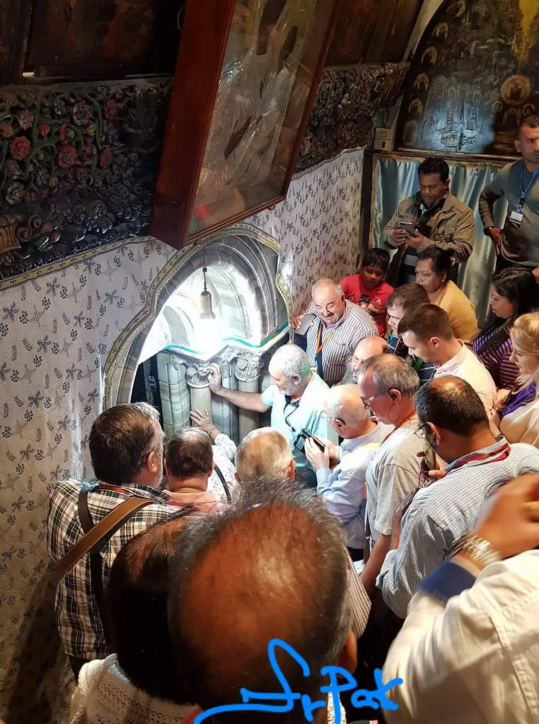 성모품에 안긴 아기예수 문위에서 내려다 보고 있다. 이 거룩한 문 안으로 초대하면서. 빛이 소록히 새어나오는 바로 그곳. 구유가 놓였던 마굿간이다. 길잡이 베들레헴의 별은 사라지고 없었다.