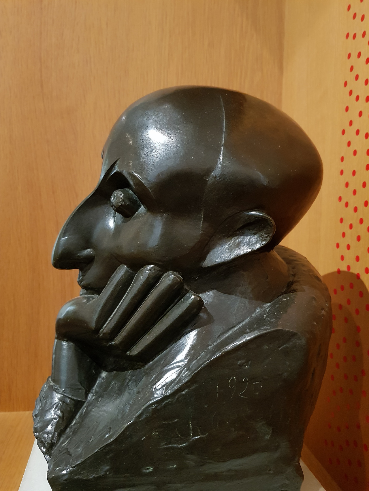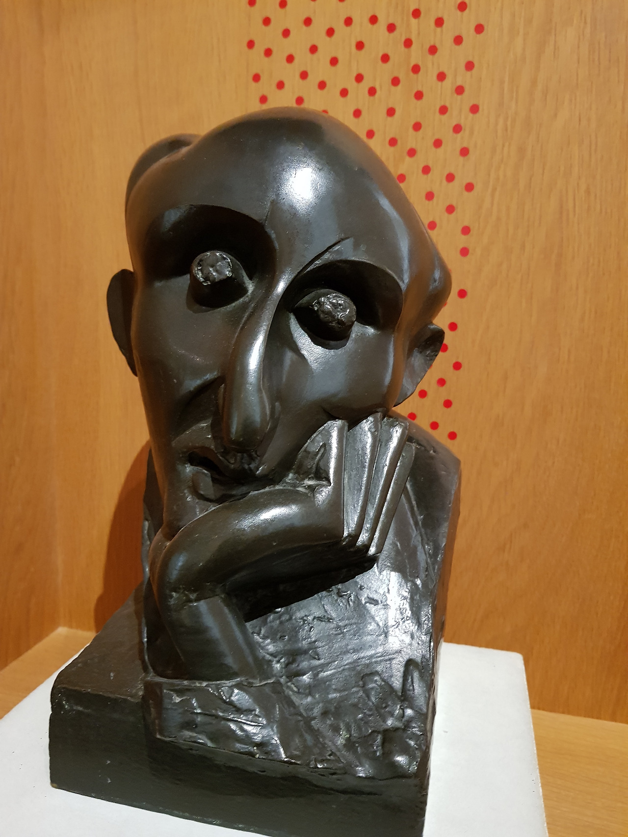사진: 파리 시내 유대인 박물관으로 들어가면 바로 정면에 이 작은 조각이 있다. 쾡한 눈과 메부리코는 유대인을 묘사했으며(유럽인이 보아왔던 차별적인 유대인 묘사) 벗겨진 머리로 그들의 우수한 지성을 보여주는 듯하다. 고요히 내면으로 사색하는 작품의 모습은 그들의 고통과 차별의 역사를 침묵으로 그러나 강렬하게 드러내는 듯하다.