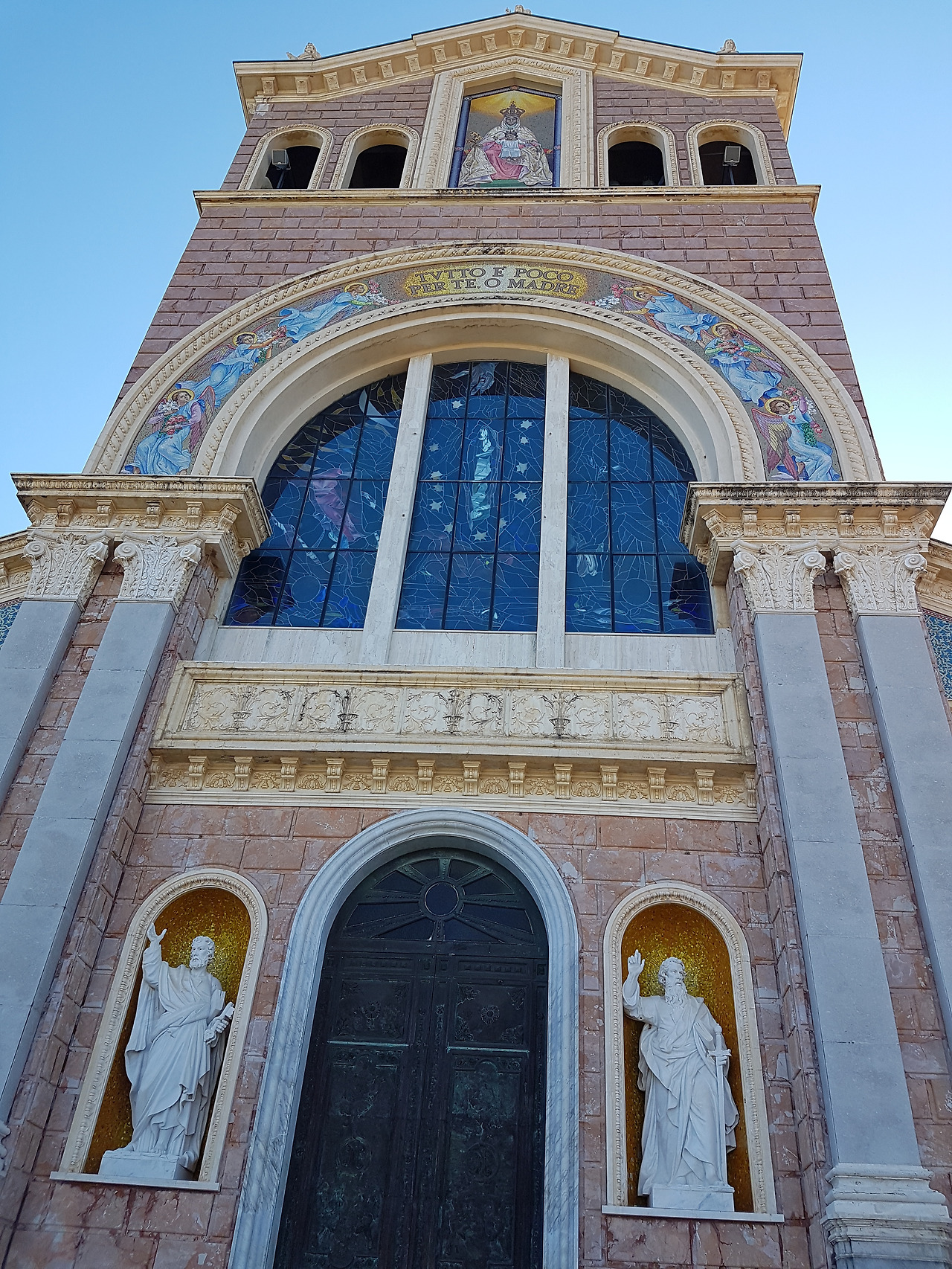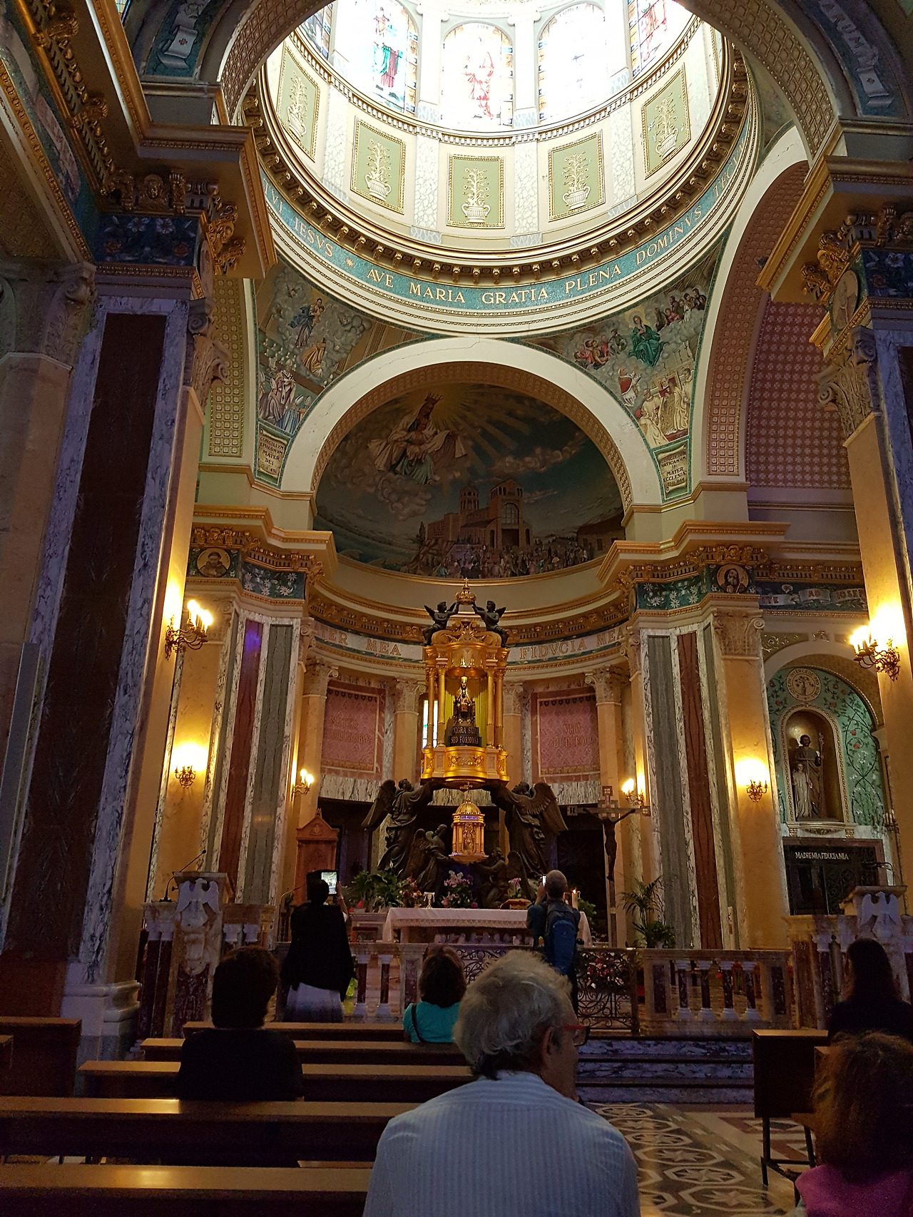 바실리카 안은 여느 시칠리아 성당과 비슷하게 바로크 스타일이었다. 스테인드글라스가 돋보였고 특히 제단 바로뒤 우뚝솟게 만든 천사들이 받치고 있는 틴다리의 성모자상은 성당의 가장 중심인 제대 뒤편에 서 있었다. 그리고 성당안에 세세하게 묘사한 모자이크 ‘십자가의 길’도 볼만했다. 각 모자이크는 천연색(technicolour)으로 화려하게 장식했다. 등장인물들도 거의 보통 사람 키높이였다. 너무도 실제적이라 꼭 2000년전 성서의 시대 사람들과 같이 걷는 것처럼 느껴졌다.