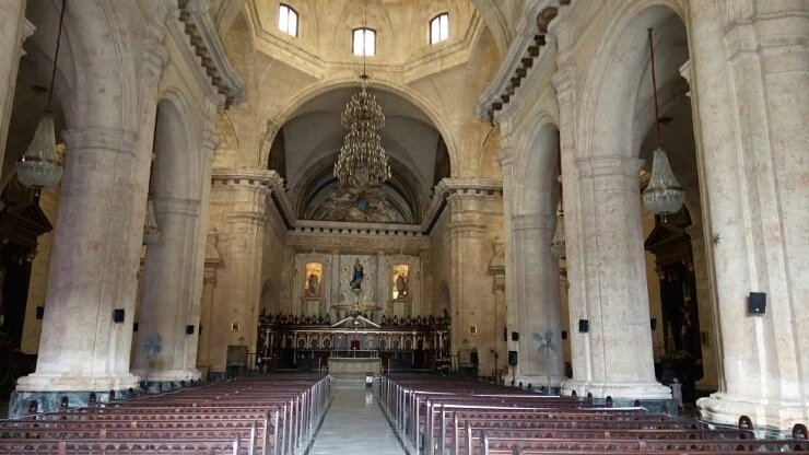 이 광장의 이름이 된 광장의 대성당은 예수회 선교사들이 오래된 성당터에 다시 1748년에 바로크 스타일로 이 성당(La Catedral de la Virgen María de la Concepción Inmaculada. 무염시태 성모님 대성당)을 재건축해 1777년에 완공했으며 쿠바의 11개 주교좌 성당중의 하나라고 한다. 아침 이른 시간이라 아직 계단위 성당문은 큰 열쇠로 굳게 잠겨있었다. 하지만 미사 예약을 했는데 지금쯤 신부님이나 사크리스탄(Sacristan)이 문을 열 시간임에도 한 20분이 지나갔다. 가이드는 쿠바타임이라고 했다. 약간 안달이 났다. 여기서 미사를 끝내고 둘러볼때도 많이 예약돼 있기 때문이다. 가이드는 이리저리 전화를 했고 성당 오른쪽 종탑을 지나 어디론가 사라졌다 한 오분후에 다시 나타나 모두들 그쪽으로 오라고 손짓을 했다. 우리는 우루루 해안도로쪽에 나있는 다른 문으로 해서 성당안으로 들어갔다. 거기에 경상도 말로 ‘난닝구(웃 속옷. 사실은 Running Shirts의 일본식 말)’만 걸친 60대 정도의 배가 불룩나온 쿠바 신부님이 우리를 환영했다. 난닝구만 걸친 소탈한 신부님을 보자 무례하다기 보다 웃음이 나왔다. 한여름에 집안에서 편안하게 입고 다녔던 그 난닝구를... 여기서 보다니. 가족들과 편안하게 난닝구만 걸치고 거실 바닥에 앉아 수박을 쪼개먹던 즐거운 기억이 떠올랐다. 갑자기 시원한 수박을 한입 깨문것처럼 성당안이 시원해졌다. 영어를 못하시지만 가이드의 통역으로 신부님으로부터 성당 역사를 들을 수 있었다. 역대 교황님들이 이 성당을 다녀가신 이야기도 빼놓지 않았다. 아직도 성당의 정문은 닫혀있어서 우리는 비교적 조용하게 성당안을 구경할수 있어서 좋았다. 나는 본 성당 옆에 딸려있는 채플에서 우리 그룹과 함께 미사를 드렸다.