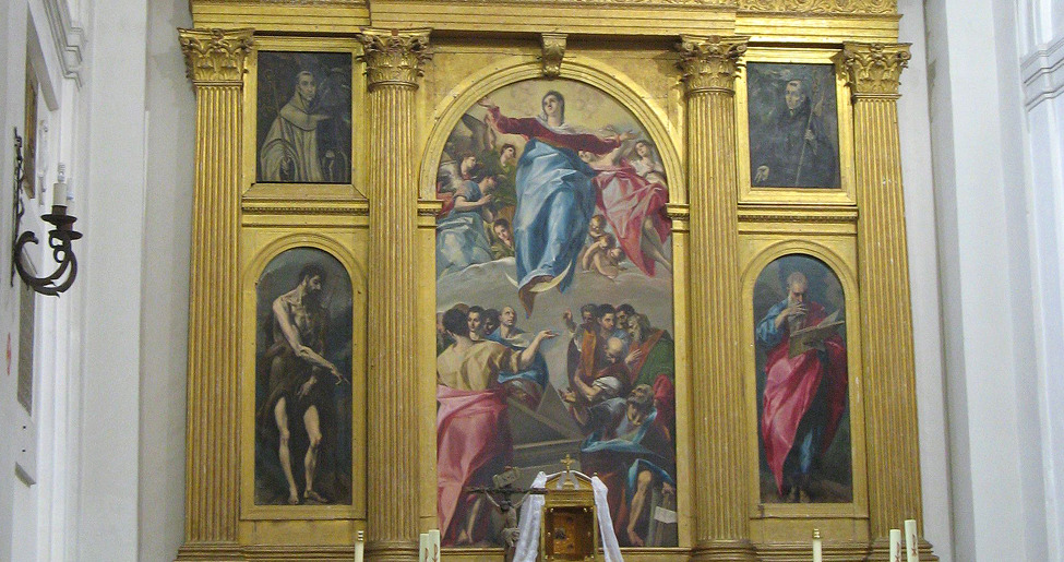 ‘엘 그레코(El Greco)’가 그린 ‘성모승천(The Assumption)’은 우선 엄청 큰 그림이다. 높이가 4미터가 넘고 폭이 2미터가 넘는다고 상상해보라. 이 그림은 스페인의 옛 수도, ‘톨레도’의 ‘산토 도밍고 엘 안티구오(Santo Domingo el Antiguo)’ 성당의 중앙 제단화로 그려졌다. 그리스의 크레타 섬 사람인 엘 그레코가 스페인에 정착하고 처음 주문받은 작품으로 화가가 그 전에 살았던 베니스의 ‘티치아노(Titian)’의 ‘성모승천’과 비슷한 분위기를 연출한다. 그러나 티치아노의 삼단으로 구분된 성모승천과 다르게 이 그림은 이분으로 구성되었다. 즉 천사들과 중앙의 승천한 성모가 있는 천상부분과 제자들이 있는 지상부분이다. 그래서 관람자는 우선 이 하늘과 땅을 구분해서 보아야 하며 더 나아가 이 두 세상을 연결시키는게 그림을 읽는 방법이다.