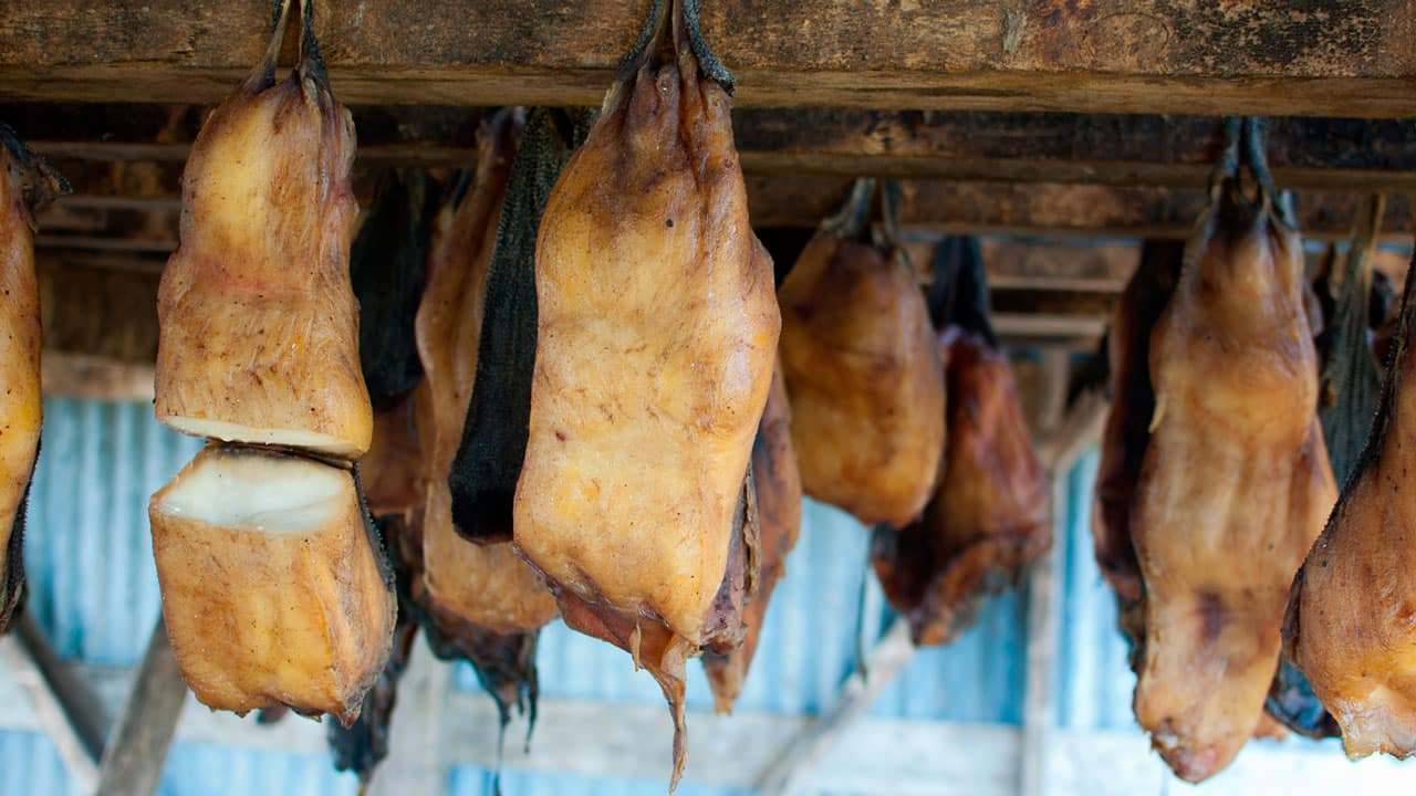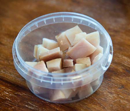 먼저, ‘하칼(Hákarl 또는 kæstur hákar)’은 아이슬란드 말로 ‘상어(shark)’을 뜻하며 아이슬란드 국민 음식이다. 이 요리는 특별한 방법으로 삭히고('썩히고'가 더 정확할지 모른다. 우리나라 젓갈처럼) 빨래처럼 바닷가에 걸어 두고 말려 만들며 약 4-5개월의 시간이 걸린다고 한다. 한가지 조심할 것은 삭힌 고기라 아주 지독한(소변냄새같은) 냄새가 나며 비릿비릿한 생선 냄새도 난다. 여행가이드가 경고했듯이 냄새가 과연 지독하였다. 김치냄새는 저리가라 할 정도였다.