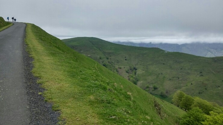 처음부터 오르막이 계속되었다. 그러나 늦었다는 부담감이 시작부터 발걸음을 재촉시켰다. 상쟝을 벗어나자 한 두명의 순례자들이 드디어 보였다. 다들 나보다 더 큰 배낭을 짊어지고 순례자 지팡이를 짚으며 가고 있었다. 배낭뒤엔 산티아고 순례자의 표시인 조개 껍질이 보폭을 따라 찰랑거렸다. 산을 오를수록 내 뒤에 펼쳐진 상쟝 마을은 점점 멀어지고 또 작아지고 있었다. 안 돌아보기로 했지만 자꾸 얼마나 올라왔는지 뒤돌아 보았다. 순례자들은 두 세명씩 무리를 지어 오르고 있었다. 나의 걸음은 빨랐고 또 몇 팀을 제치고 나니 신도 났다. 프랑스인고 제치고 미국인도 제쳤다. 그리고 발빠른 독일인도 제치며 끊임없이 얘기하며 걷는 브라질 팀도 쉽게 제쳤다. 그러나 오르막길을 그렇게 빠른 보폭으로 걸으니 숨이 가빠오고 한 시간 정도 지나자 힘이 쑥 빠졌다. 조금 가면 평지가 나오겠지... 그러나 이 곳이 1500m 높이의 산이며 스페인과 프랑스의 국경이다. 힘들었지만 가끔씩 뒤돌아 왔던 길을 보며 또 올라갈수록 더 아름다워지는 산 능선을 보며 갖은 힘을 다 내었다. 가끔씩 멈추어 서서 가지고 온 스마트 폰으로 사진를 찍지 않고는 지나칠 수 엊ㅅ는 아름다운 곳이었다. 이 아름다운 풍경을 놓지고 쉽지 않았다.
