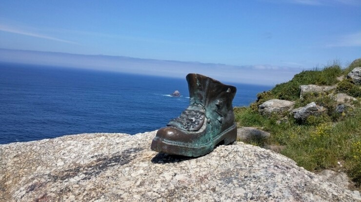 내가 피니스테르에 도착했을 때도 가파른 해안가 바위들 사이 사이에 신발과 소지품을 태운 흔적이 검게 남아있었다. 타다 남은 신발의 나머지 반쪽을 볼수도 있었고 또 아예 태우지 않고 바위위에 가지런히 놓아두고 간 주인없는 신발도 여러 켤레 보였다. 또 많은 사람들은 이 신발을 들고서 대서양을 배경삼아 사진도 찍었다. 심지어 한 바위위엔 등산용 신발 조각품도 있었다. 가만히 바위위에 걸터 앉아 대서양 바다를 내려보며 저 신발을 태운 순례자의 마음을 헤아려 보았다. 자기의 순례 동반자인 신발을 태우면서 그들은 어떤 심정이었을까?