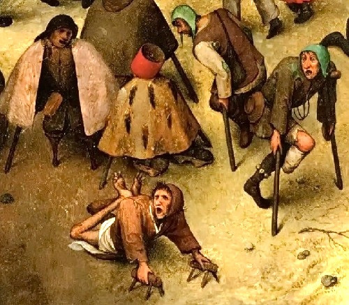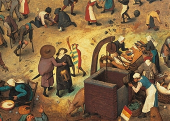 광장의 모습. 특히 불구자들의 모습도 생생히 브뤼겔은 그려넣었다. 약 500년 전(1559년)시대상과 사회상을 한 그림 안에 오롯이 보여준다. 특히 앞쪽의 아저씨는 남대문시장 등 전통시장에서 많이 보았던 고무 튜브를 아랫부분에 동여맨체 물건을 파시거나 동냥을 하시던 분들을 기억나게 해서 안타깝고 슬프다. 언젠가 모든 분들이 평등하고 행복하게 사는 그 날이 빨리 왔으면 하고 고대한다.