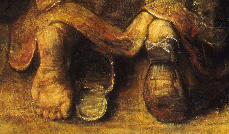 그럼, 이 아버지 앞에 꿇어앉은 측은한 탕자인 아들의 모습을 보자. 우선 행색이 말이 아니다. 아버지와 오른쪽에 서있는 형이 걸친 화려한 붉은 색 겉옷에 비해 이 탕자는 닳아 누추한 옷을 걸치고 있어 그가 어떤 삶을 살았는지 단번에 보여준다. 탕자가 걸친 옷은 찟겨져 꿇어앉은 그의 허벅지가 다 보인다. 돼지우리에서 일할 만큼 그의 삶은 갈 때까지 갔었다. 구약의 이스라엘인들은 모세오경 ‘레위기’에 쓰여진 유대인의 정결례에 따라 돼지는 불결한 동물이며 그래서 유대인들은 무슬림처럼 돼지고기를 안 먹는다. 그만큼 죄악의 불결한 동물이란 뜻이다. 예수님이 악마들린 사람을 치유할때도 악령은 다른 동물이 아닌 돼지에게 옮겨갔다는 또 다른 성서 구절도 이를 뒷받침해준다. 그런만큼 둘째 아들이 돼지우리에서 일했다는 것은 종교문화적 상징성도 크다. 이 아들의 삶을 또 극적으로 보여주는 것은 다 헤져 뒷축이 닳아 없어져버린 슬리퍼다. 그것도 아버지를 보자마자 달려와 그대로 꿇어앉았는지 왼쪽 슬리퍼는 벗겨져 있다. 그리고 벗겨진 거친 왼쪽 발바닥을 관람자에게 그대로 다 내 보이고 있다. 이제 남은것은 아무것도 없고 잃을 것도 아무것도 없다. 세상의 끝에서 인생의 끝자락에서 오직 ‘용서빌기’ 만이 그가 할 수 있는 일이다. 그런 그에게 털끝만큼의 기대도 없다. 이는 그의 삭발한 머리를 보아서도 알수 있다. 혹자는 머리칼 속 들끓는 ‘이’로 인해 삭발했다고 하며 이는 얼마나 그가 거친 삶을 살았는지 요약해 보여준다.