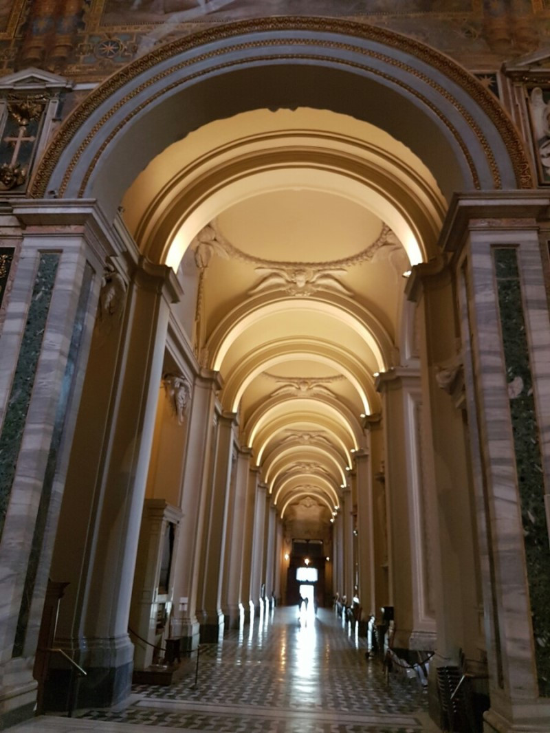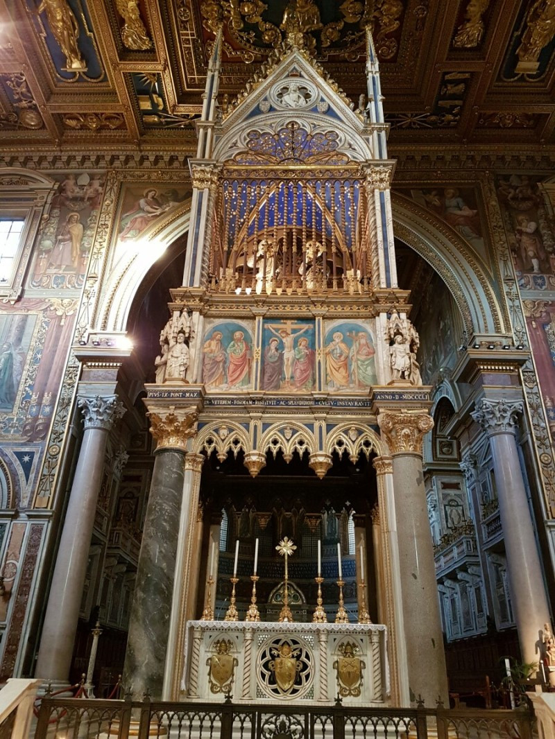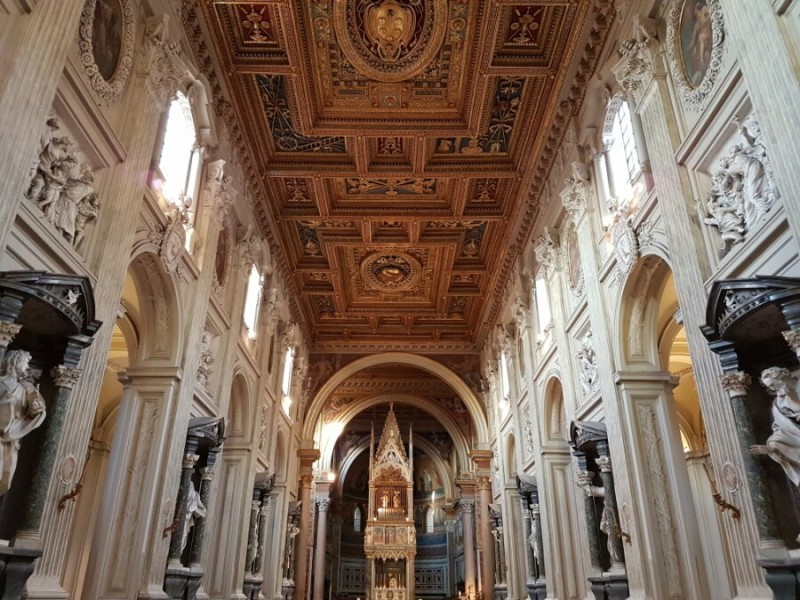 이 대성당의 정면은 18세기 초에 세워진 네오-클래식 양식의 성당이다. 이른 아침에 긴 줄서서 기다릴 필요도 없이 들른 이 대성당의 내부에 들어서자 우선 그 거대한 크기에 압도되었다. 높은 성당 천장의 장식을 구경하느라 목도 아팠다. 그러나 그냥 지나칠 수 없었다. 성당안의 12개의 벽감(niche. 벽의 움푹 들어간 부분. 보통 성당에서 성상을 세움)은 바로크의 대표적 건축가 '베르니니(Bernini)'와 라이벌 관계였던 유명한 건축가 '보로미니(Borromini)'가 설계했다고 한다. 하지만 오랫동안 비워져 있다가 후에 신약성서에 나오는 12사도들 조각을 세워 넣었다. 각 사도들의 특징을 보여주는 아이코노그라피를 읽느라 정신도 없었다. 로마의 주교좌 성당이라 역대 교황들의 동상도 있었다. 그러나 성벽밖의 바오로 바실리카(St Paul’s Basilica outside the Wall)암에 새겨진 역대 모든 교황들의 모자이크처럼은 아니었다. 그 중에 ‘노동칙령(Rerum Novarum)’을 공표하고 신-토미즘 철학을 추천하고 후원한 레오 13세 교황의 동상도 있어서 반가웠다.