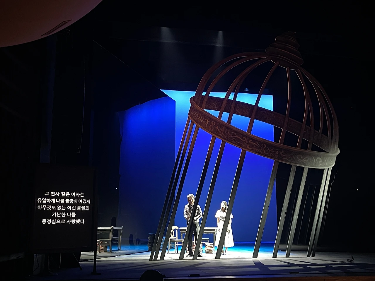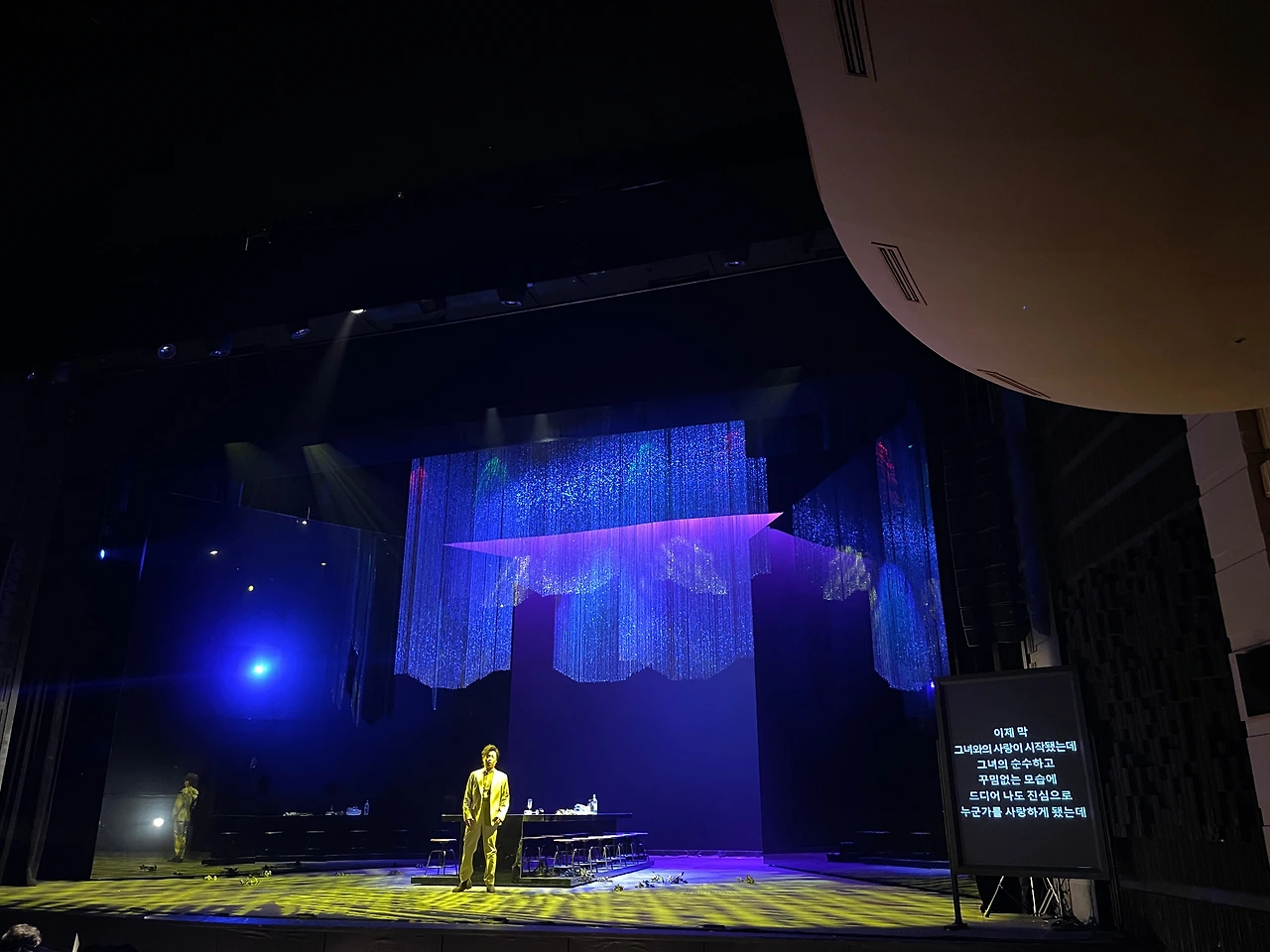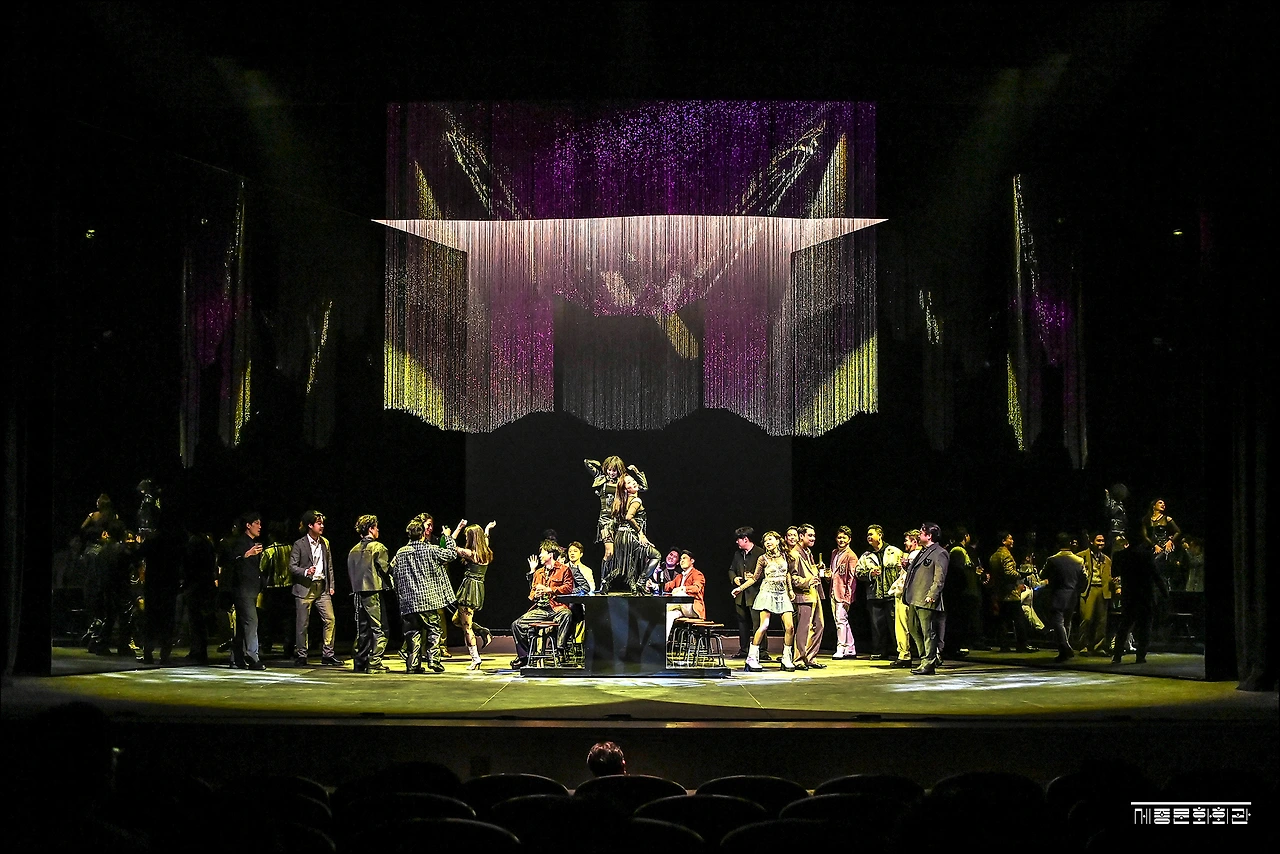 이곳 M시어터는 1,2층에 걸쳐 600여 석의 규모를 갖추 있는 중극장 규모의 종합 구성물 전문 공연장이다. 오케스트라팀은 무대 앞쪽에 상하로 리프트가 설치된 무대에서 오페라 반주를 연주하고 있었고, 원어로 진행되는 오페라 내용 전달을 위한 스크린이 좌우 양쪽에 준비되어있었다.