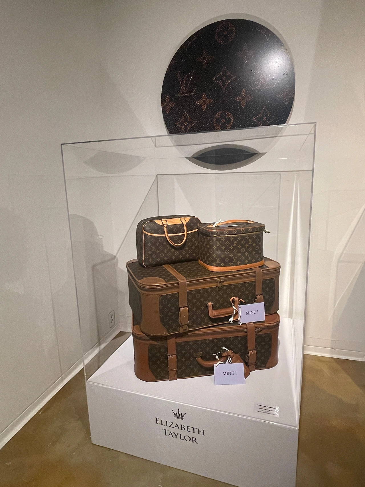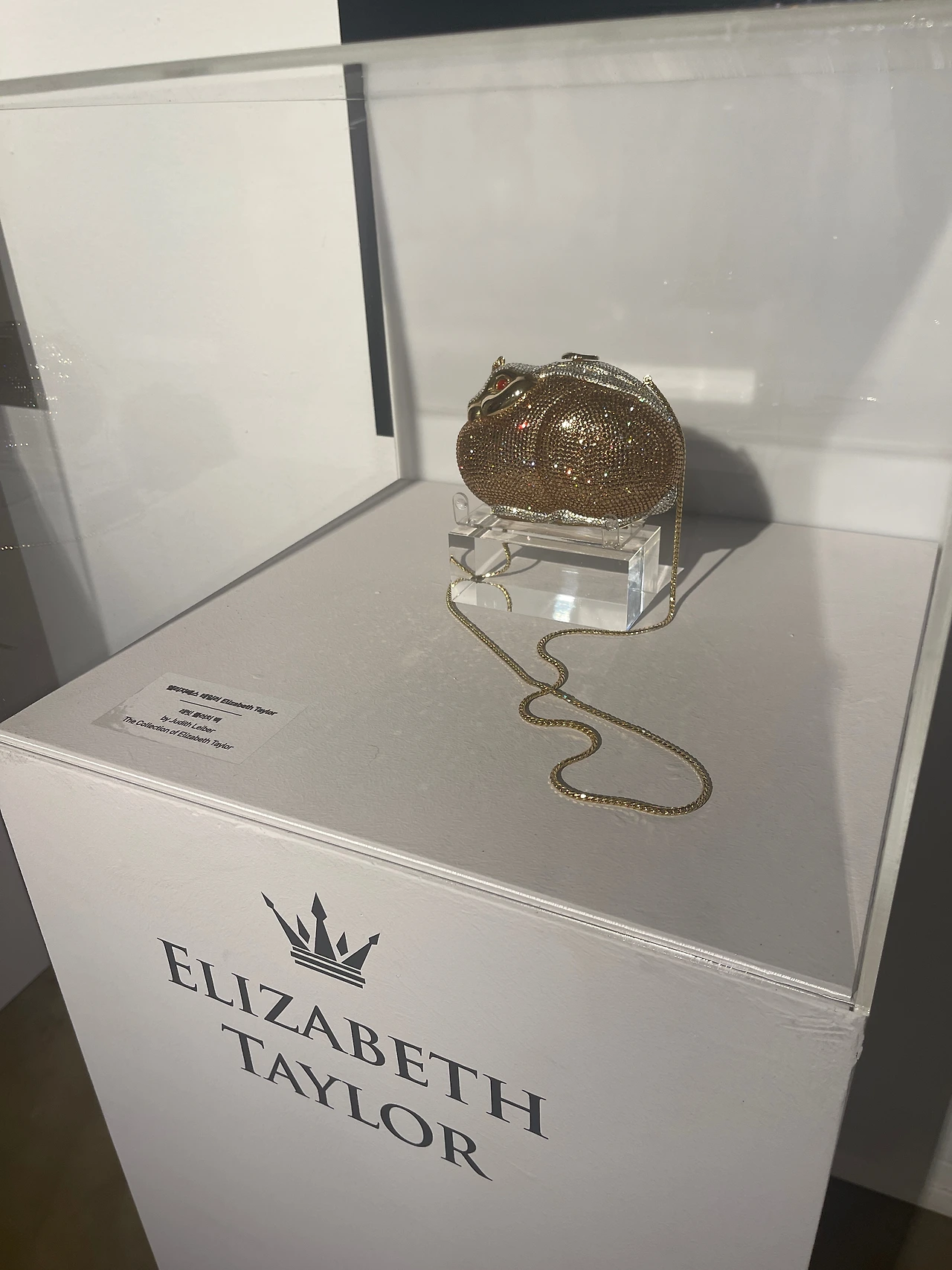 배우 엘리자베스 테일러는 고전 할리우드 시대의 전설적인 배우로, 30년 가까이 영화에 출연하며 세계적인 명성과 인기를 누른 스타이다. 그녀에게 평생의 연인이자 남편이었던 리처드 버튼의 50번째 생일파티를 위해 입은 가는 두 개의 어깨 끈이 달린 신고전주의 풍의 검정드레스는 남아공 출신의 전설적인 디자이너 크리스 레빈이 디자인 한 작품이다. 또 다른 가방은 그녀가 애용하던 가방으로 '미노디에르'이다. 1930년대 처음 등장한 것으로 이브닝 백 대용으로 사용되었다.