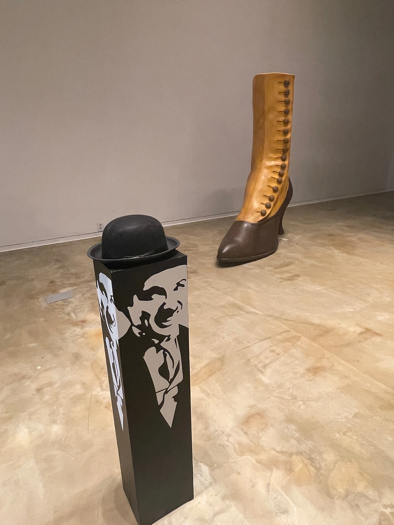 그가 쓴 중절모 모자는 19세기 중반 노동자 계층이 자주 썼던 모자로, 영화 속 맡은 역할을 통해 사회적 배경을 나타내주는 오브제였다. 함께 전시된 이니셜을 새긴 가방과 슬리퍼는 그의 희극인으로서 전 세계적 활동에서 늘 곁에서 함께 인생여행을 했던 친구 같은 존재이다.