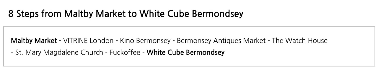 런던 동쪽에 위치한 버먼지 지역은 개인적으로 애정이 많이 가는 동네다. 2016년 여름, 처음 런던을 방문했을 때 테이트 모던과 화이트 큐브를 가보고 '집 앞에 이런 갤러리들이 있다면 얼마나 행복할까. 다음에 런던에 살게 되면 꼭 이 근처에 살아야지'라고 마음먹었다. 그리고 다음 해, 정말로 버먼지 (Bermondsey)에 머무르게 되었다. 일 년 뒤 사정이 생겨 이사를 하게 되었지만, 열두 달 동안 화이트 큐브가 있는 버먼지 거리를 수없이 지나는 행운을 만끽했다. '집 앞'이라고 하기에는 거리가 조금 있었지만 걸어서 20분도 안 걸리는 곳에 화이트 큐브가 있다는 것은 큰 행복이었다.