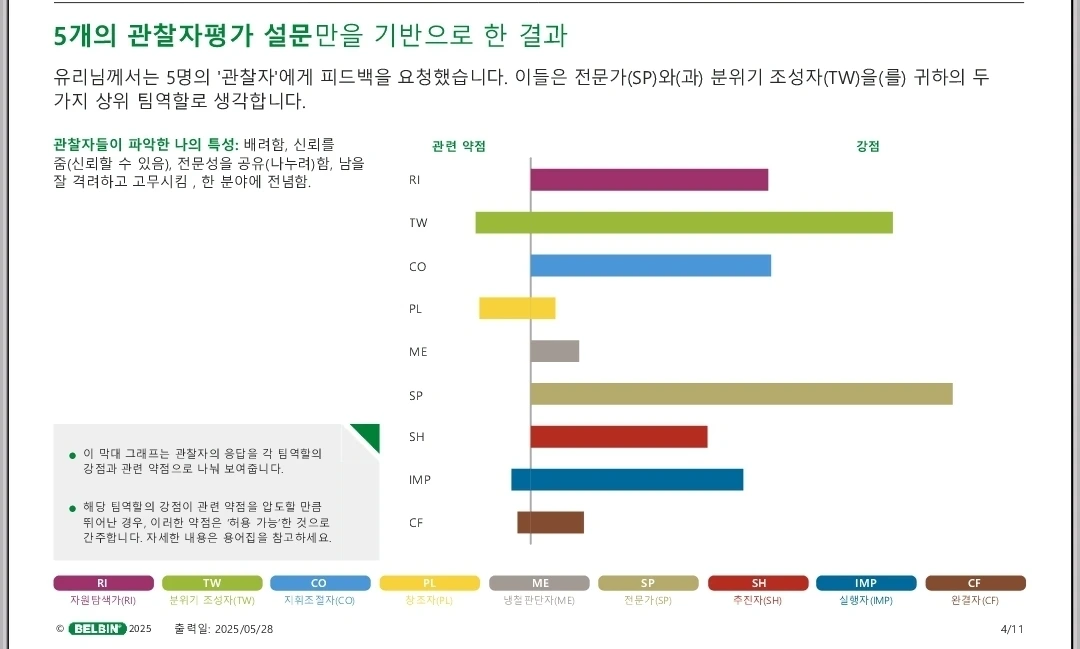 5명 관찰자 평가 결과에서는 내 상위 팀 역할이 ‘분위기 조성자(TW)’와 함께 ‘전문가’라고 나왔다. 분위기 조성자는 자가 진단 결과와도 일치하니 고개가 끄덕여졌지만 전문가라니?