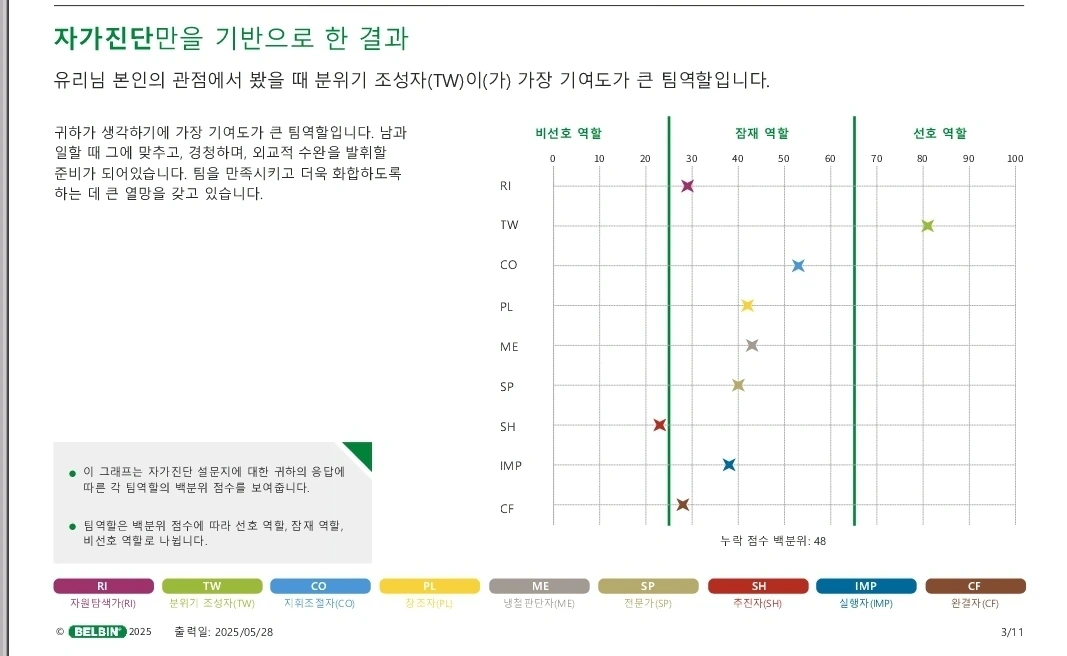 이번 벨빈 진단은 팀 성과에 기여하는 9가지 행동 유형을 기준으로 내가 팀 안에서 어떤 역할을 가장 잘 수행하는지를 보여주는 방식이었다. 자가 진단 결과, 내가 가장 기여도가 높은 팀 역할은 ‘분위기 조성자’였다.