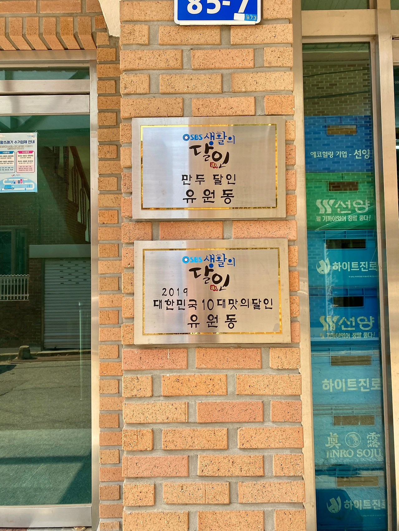 '생활의 달인' 명판이 걸린 가게의 외부. 더불어 조금 초라하지만 만두 찜기 또한 벽면에 걸려있다.