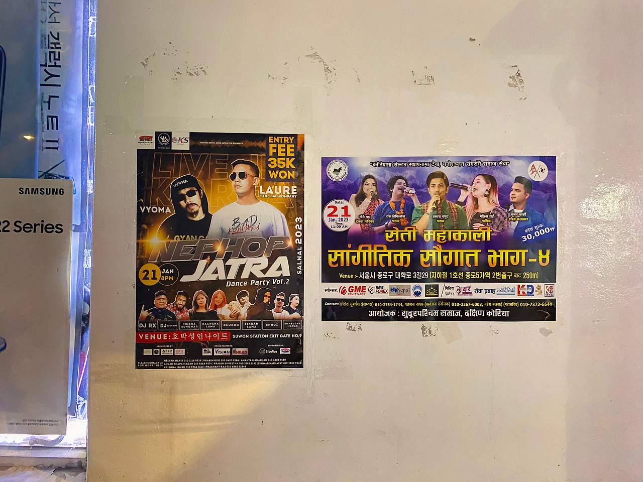 마무리는 시장을 빠져나가는 길에 마주한 정체불명의 강렬한 공연 포스터. 인상 깊다. (창신골목시장과 함께 네팔음식거리가 위치한 관계로 세계 음식의 집들도 더러 볼 수 있다.)
