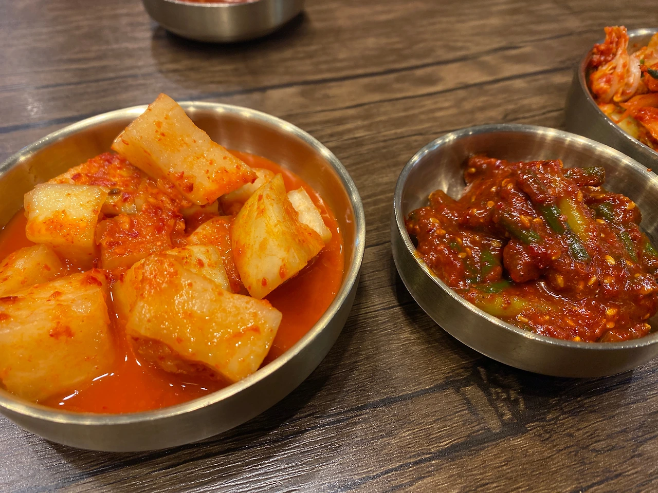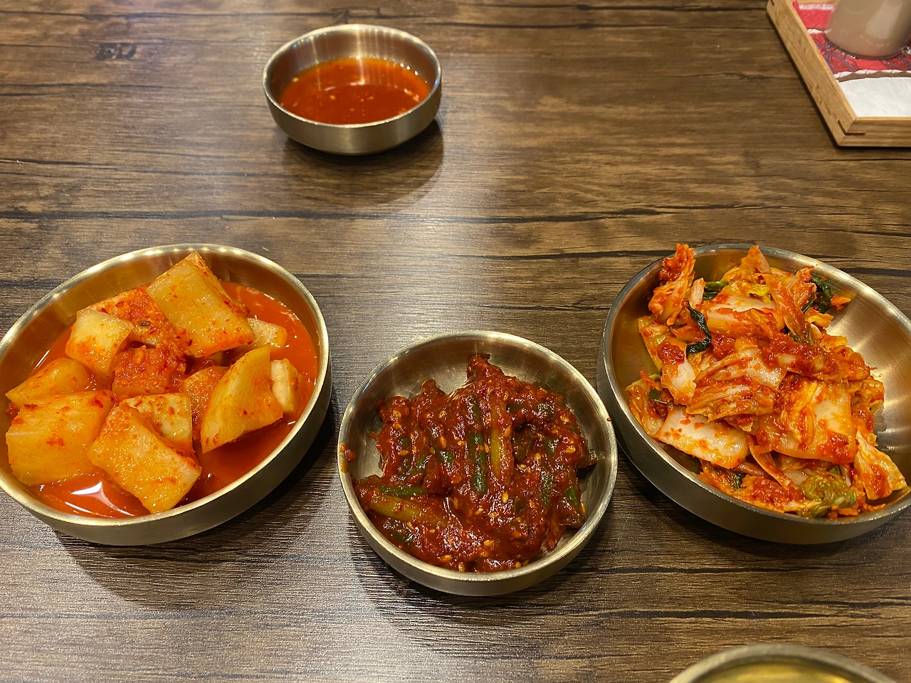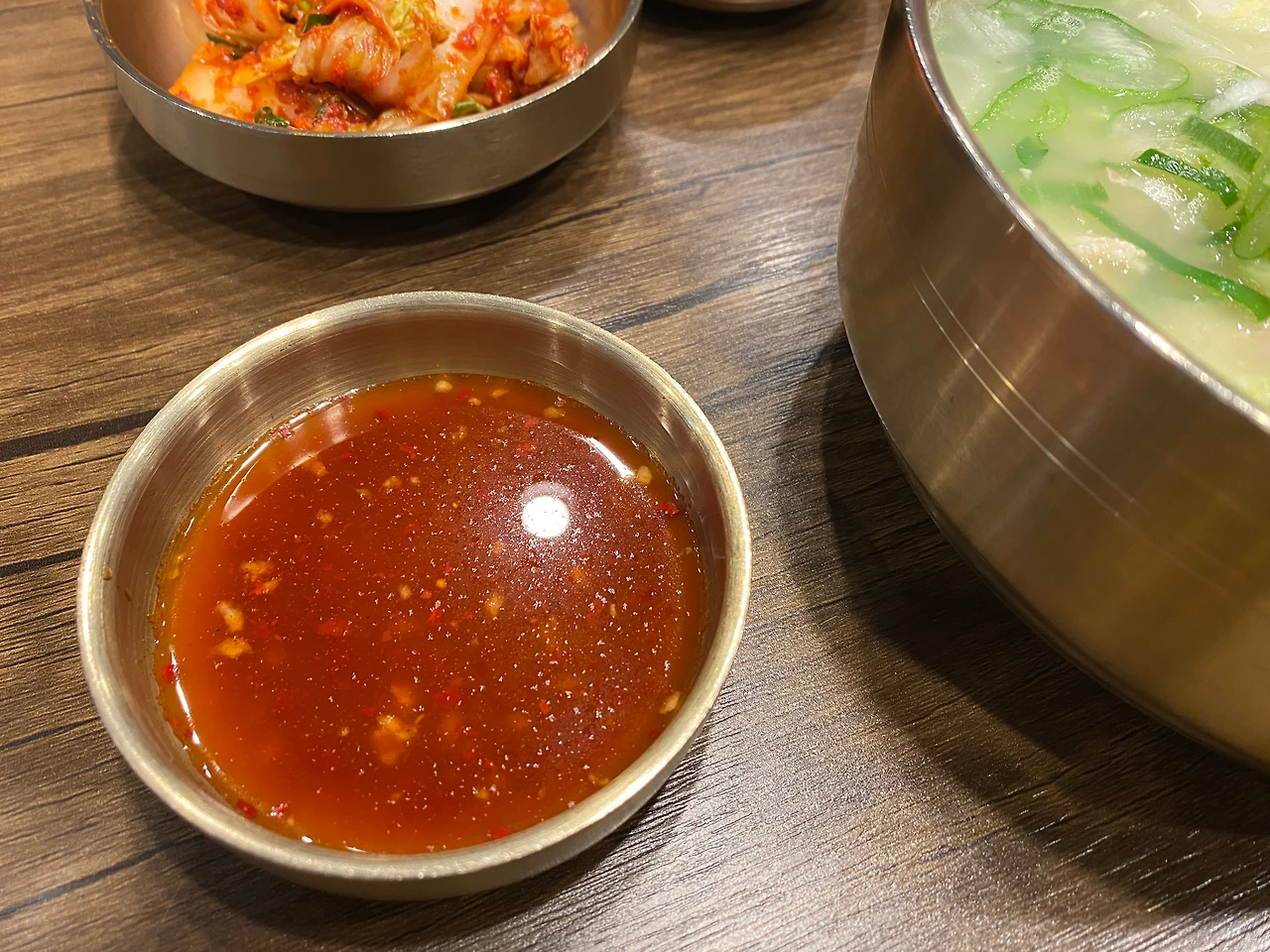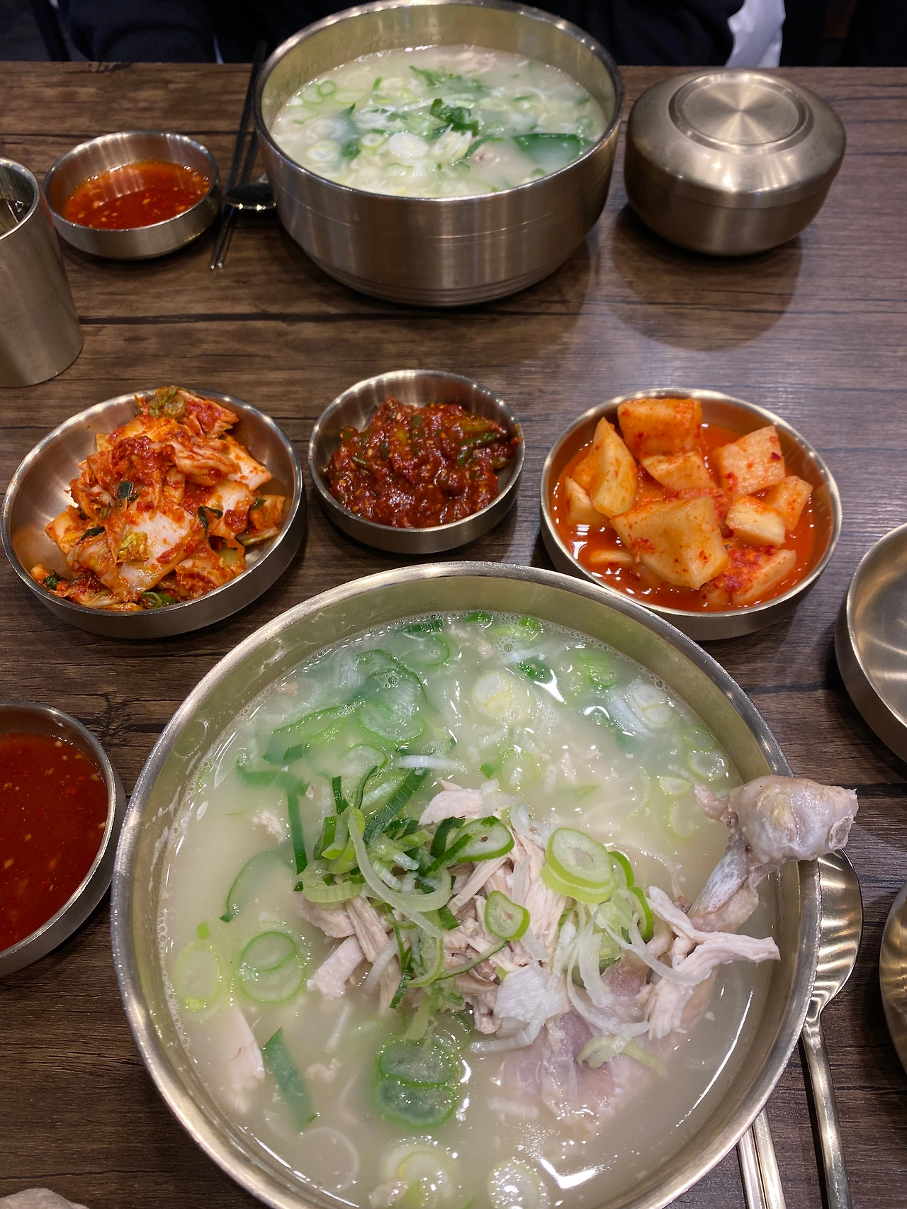기다리면서 메뉴를 주문했기 때문에 자리가 빈 곳으로 바로 안내받아 착석. 상당히 좁은 테이블로 배정받았다. 조금은 아쉽구나. 깍두기, 마늘종, 김치다. 김치는 겉절이 김치. 역시 닭곰탕, 닭칼국수에 어울리는 김치. 이래야지. 닭살을 찍어 먹을 소스도 함께 등장했다.