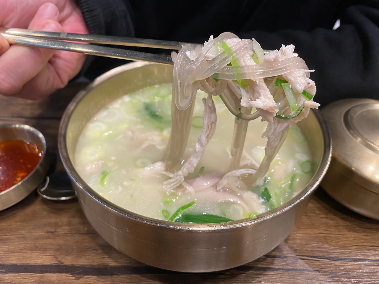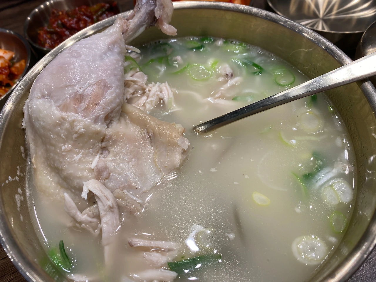 필자는 일반 닭곰탕을 연인은 닭다리곰탕을 시켰는데, 닭다리 곰탕의 차이라면 이름대로 큼직하게 든 닭다리. 넓적다리(허벅지) 부분까지 큼직하게 들어있다. 어찌 보면 누군가에겐 단점일 수도 있겠다. 큼직한 닭다리가 포함된 메뉴가 별도로 있어서인지, 일반 닭곰탕은 가슴살의 비중이 꽤나 크니 말이다.