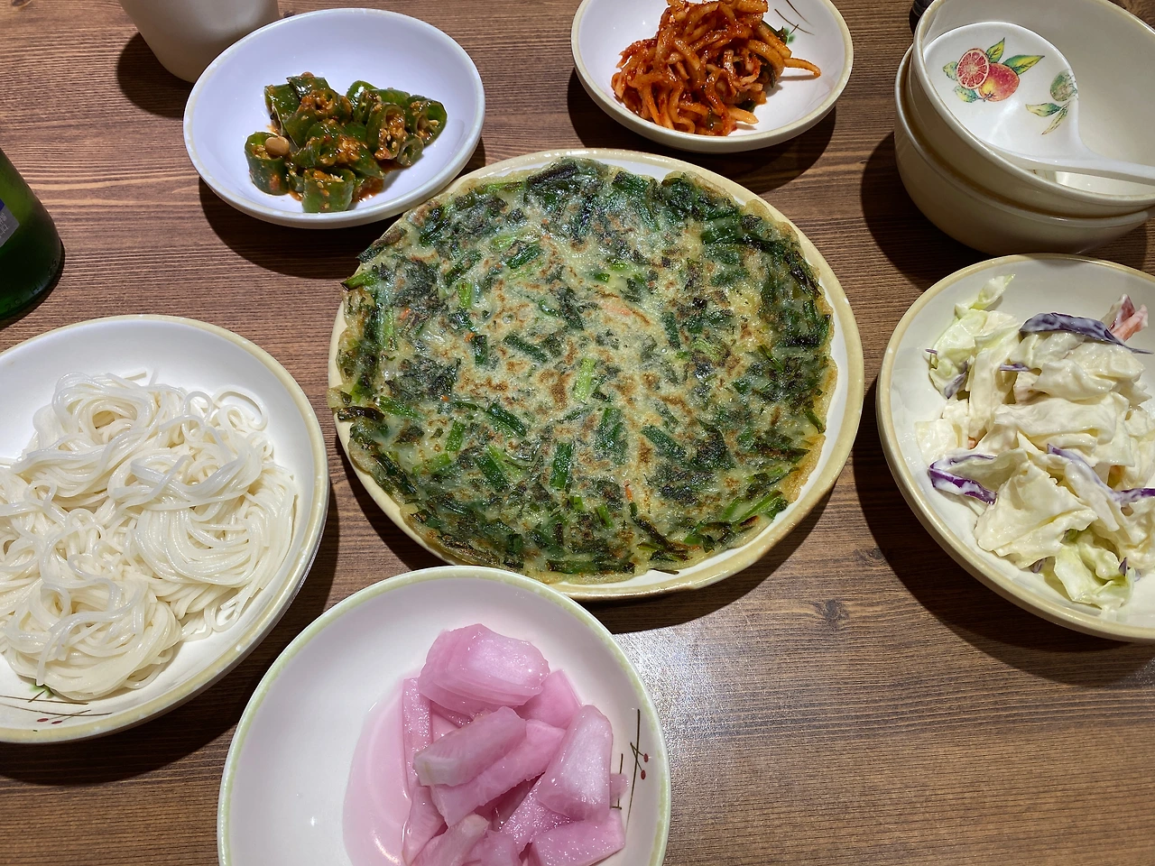 등장한 기본 찬들. 고추된장무침, 샐러드, 무생채, 무절임 등이다. 물회의 새콤한 맛을 중화시킬 미나리부추전도 함께 나왔다. 음, 찬의 구성은 조금 아쉽다. 새콤한 물회와 같이 쏘는 녀석들이 절반 정도 차지하고 있었으니 말이다. 뭉친 소면도 조금 아쉬웠으나 물회가 워낙 싱싱해 어느 정도 감안되는 요소들이다.