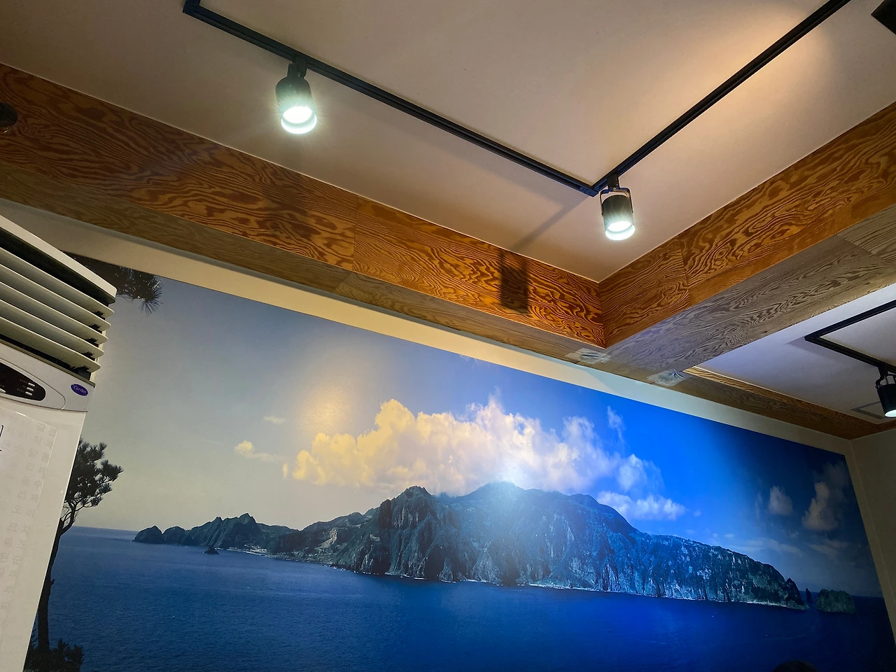 벽 한 면에는 '횟집울릉도' 상호답게 대형 사이즈의 울릉도 전경 사진이 자리 잡고 있다.