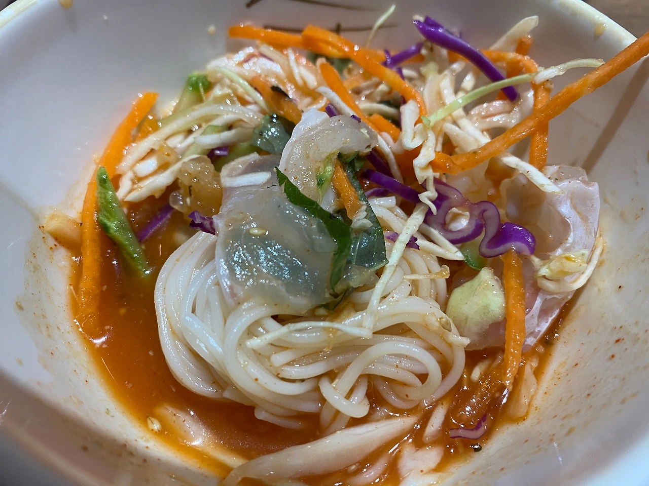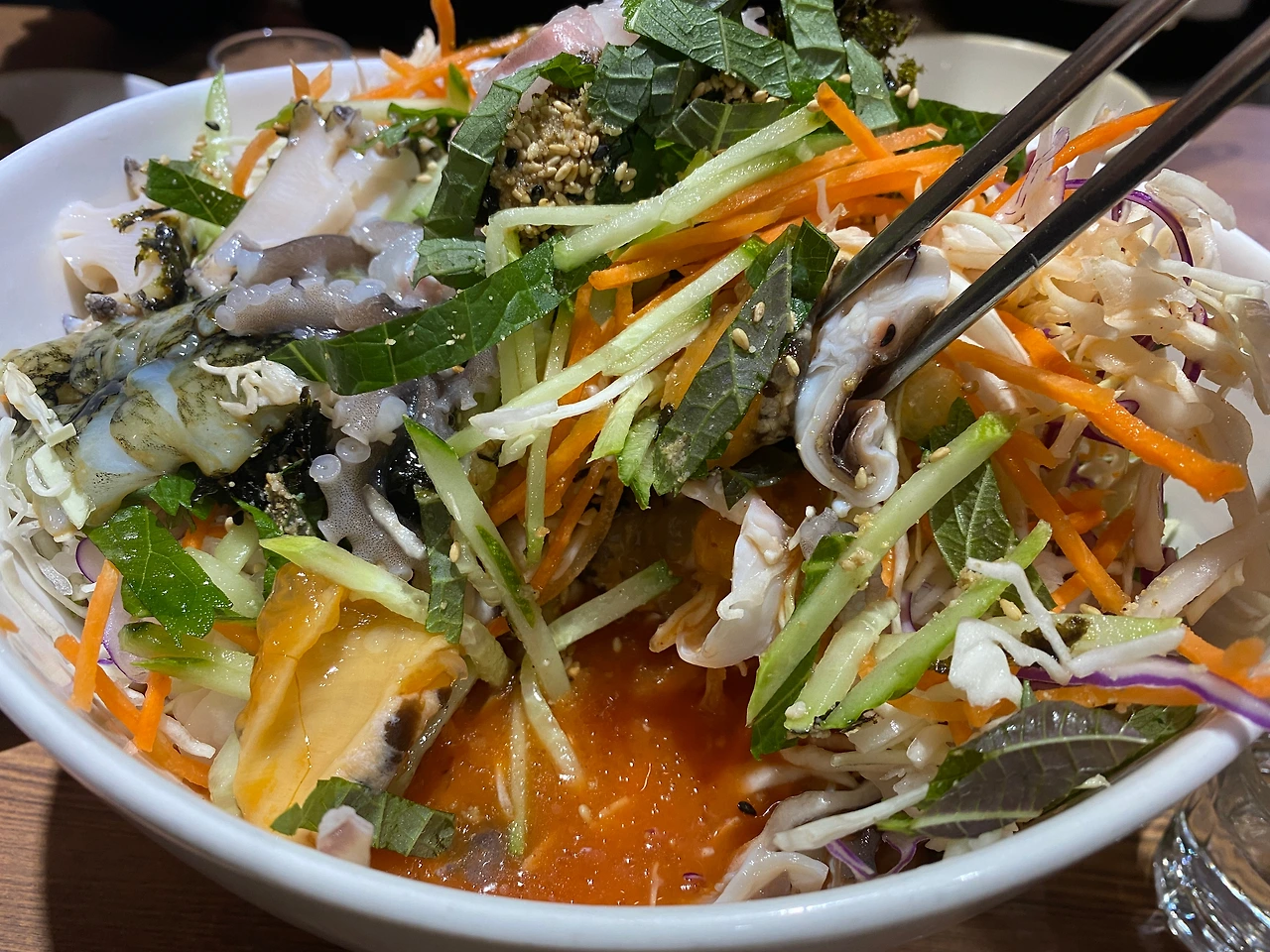 수북하게 올라간 야채와 해산물을 들어내면 아래엔 물회 육수가 한가득이다. 덜어냈다가 장에 찍어 별도로 먹어도 되고 통으로 비벼도 된다.