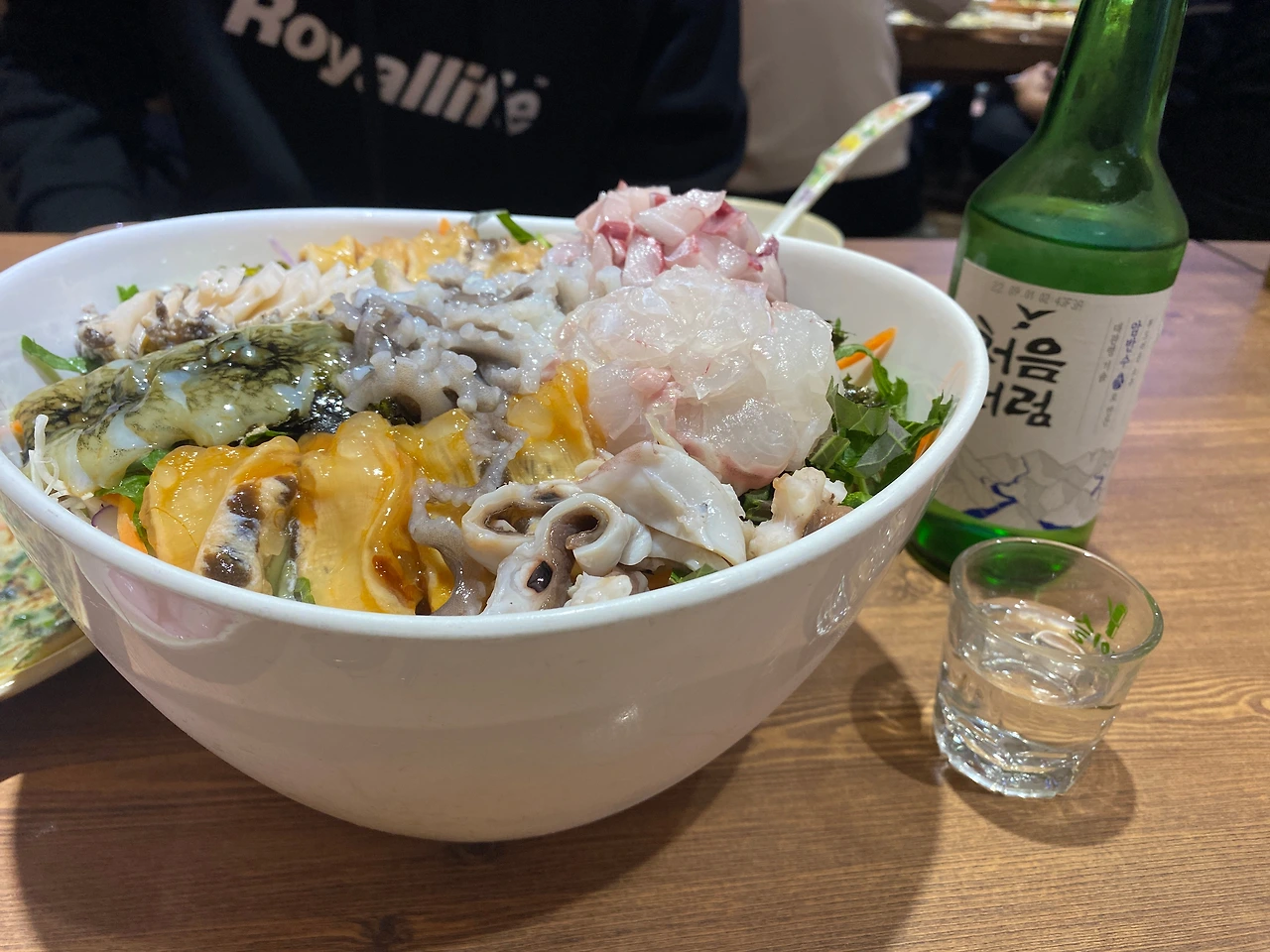 물회와 슥슥 비벼 한 그릇. 좋구나. 물회 육수는 깔끔하고, 기본적으로 횟감들과 해산물들이 정말 싱싱하다. 꾹꾹한 해삼, 육수로 쌉싸름해진 부드러운 멍게, 뚜걱뚜걱 산낙지와, 서걱한 바다 향의 전복까지. 식감과 맛 모두가 다채롭다. 온갖 존재하지 않는 형용사, 부사들을 남발하게 되고, 그것들이 한데 어우러진다.