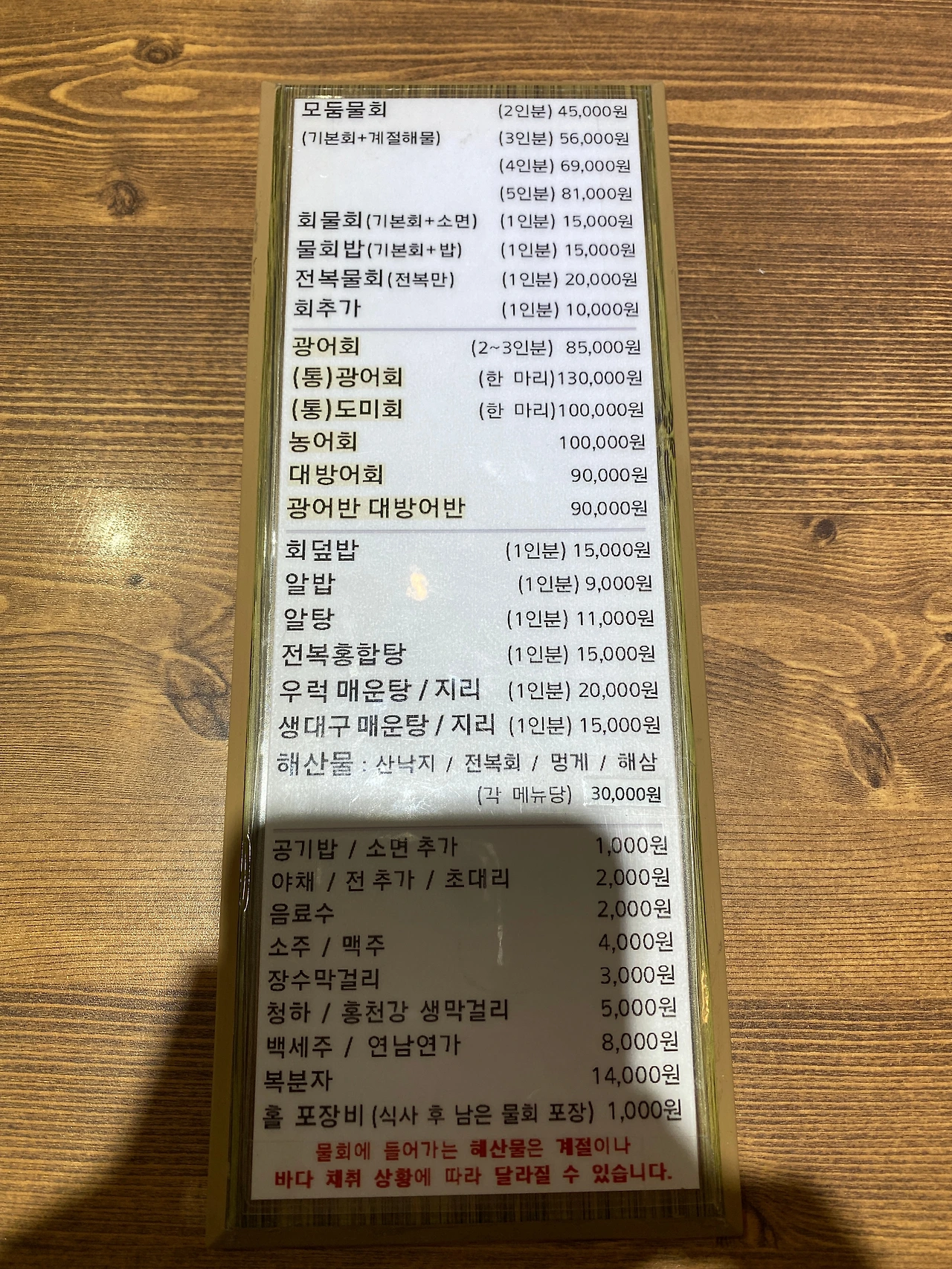 - '모듬물회'를 주력으로 하며 동절기엔 활어회도 개시 중