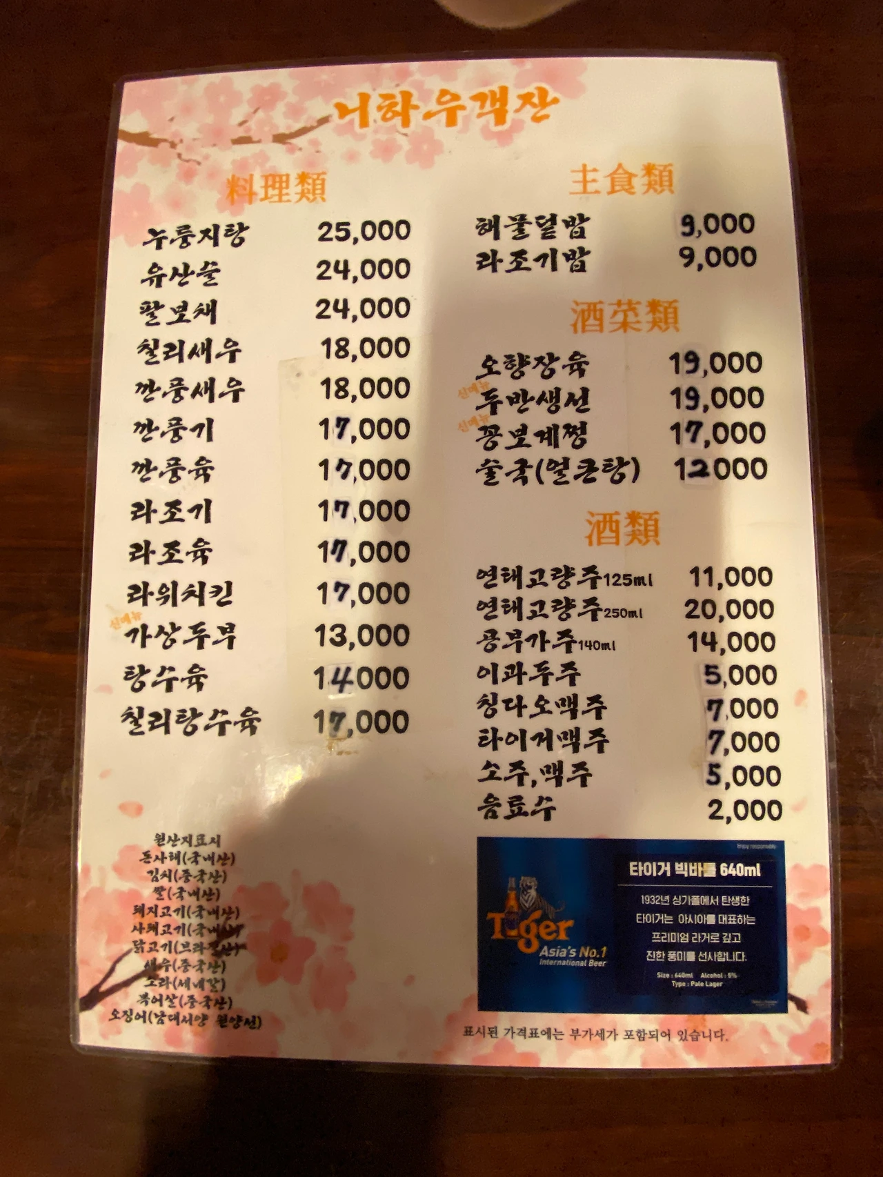 '니하우객잔'의 메뉴판. 짜장면과 짬뽕은 없다. 술과 함께 즐기는 전형적인 야간형 중식당. 마음에 드는구나. 익숙한 요리류와 주식류, 안주류와 술로 구성되어 있다. 두반생선을 주문하려 했으나 아쉽게 재료가 공수되지 않아 선택한 것은, 탕수육과 술국(얼큰탕). 추운 날씨엔 중국 술 만한 것이 없는데 연인의 기피로 소주로 대신한다.