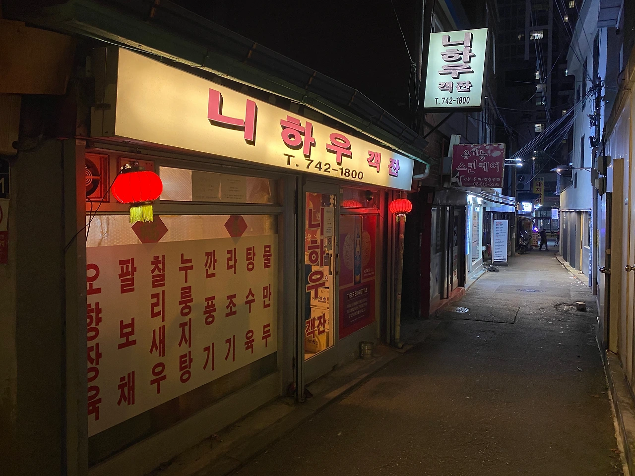 이름에 매료되어 방문한 집. 니하우도 니하우지만 '객잔'이라니. 중국풍이 물씬 느껴지는 집이다. 이름에서부터 술도 겸해 먹는 중화포차의 느낌을 확 받는데, '소문각'을 추억하며 방문한 집. 독립문역과 서대문역 사이, 영천시장 인근에 위치한 그곳. 소개할 곳은 '니하우객잔'이다.