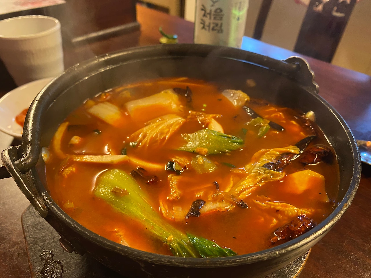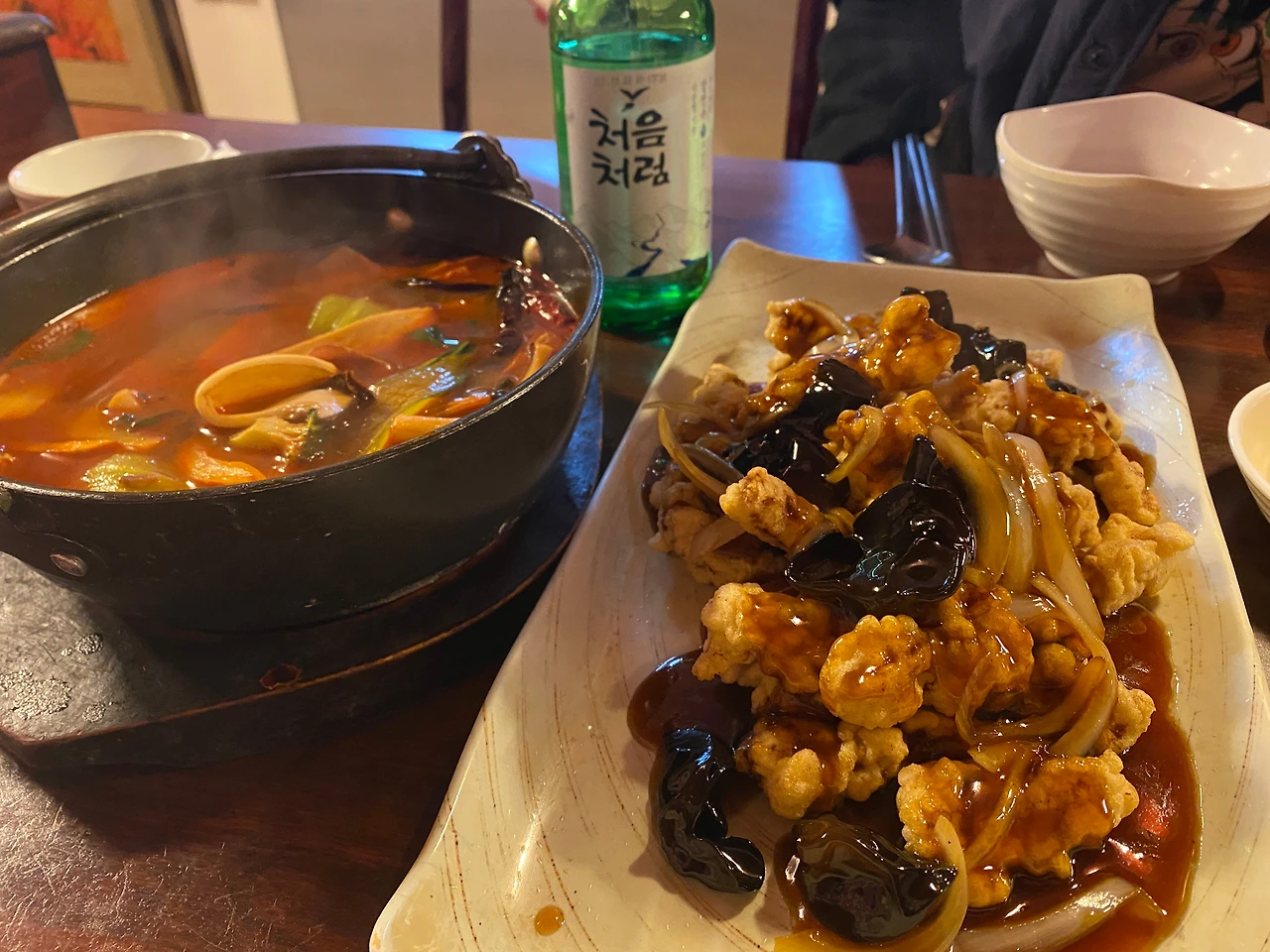 그리고 등장한 술국(얼큰탕). 짬뽕탕에 가깝다. 죽순, 송이버섯, 청경채, 오징어, 배추가 주를 이루는데, 고추와 함께 불맛이 가미된 찐하고 그윽한 짬뽕탕이다. 한입 먹자마자 하오(好)를 연발한다. 술꾼들을 위한 술의 신호탄을 알리는 맛. 재료들의 식감이 살아있어 신선함도 느껴지는 맛.