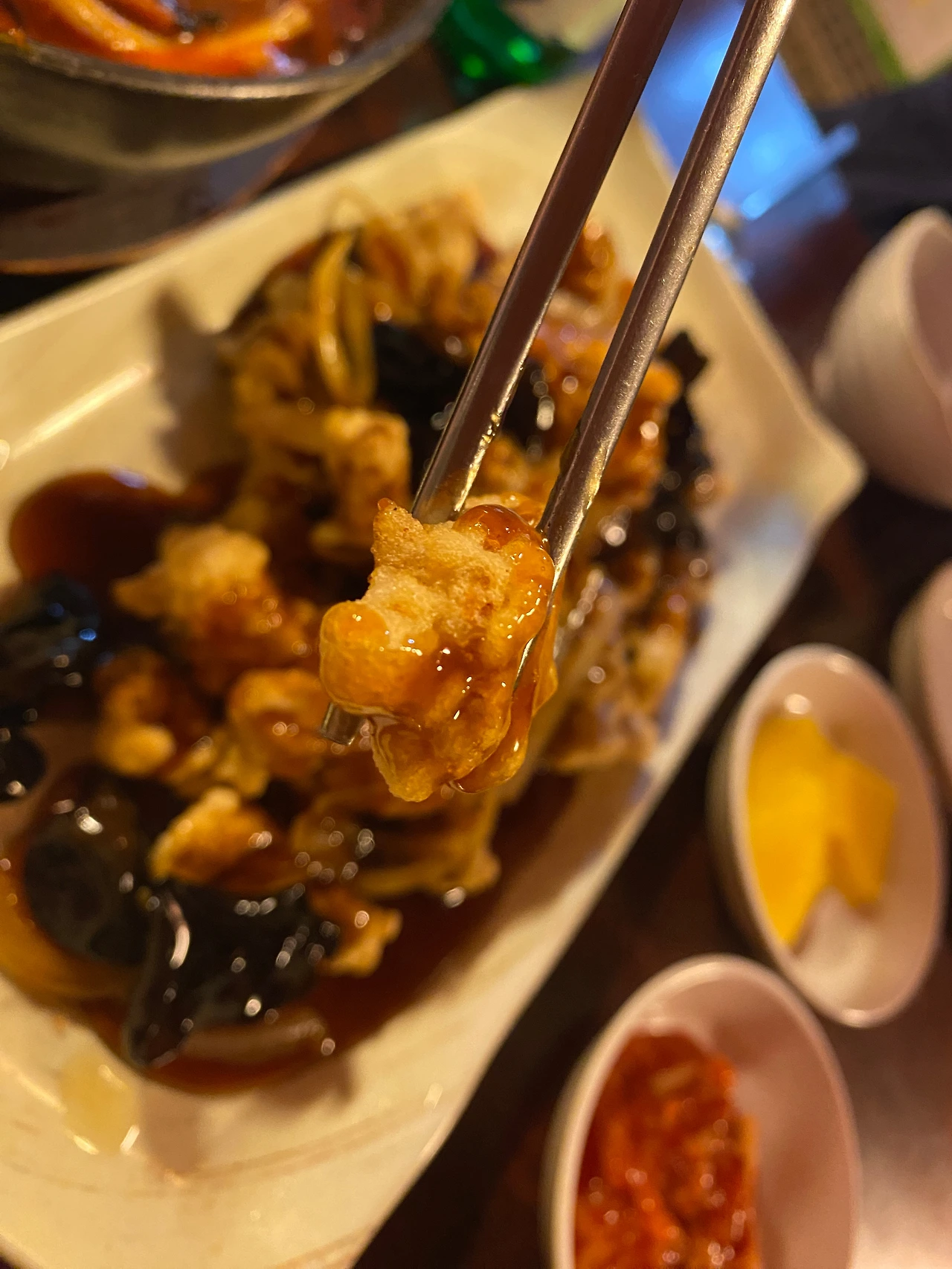 이어 등장한 것은 주문한 탕수육이다. 가장 주문이 많은 듯해 고른 음식인데, 시키고 나니 잘 시켰다 싶구나. 부먹, 찍먹에 답은 없으나 정말 맛있는 중식당은 항상 부먹을 고수하지. 필자의 경험상 그렇다. 필자는 오늘 영화 속 주연, 하정우가 되련다.