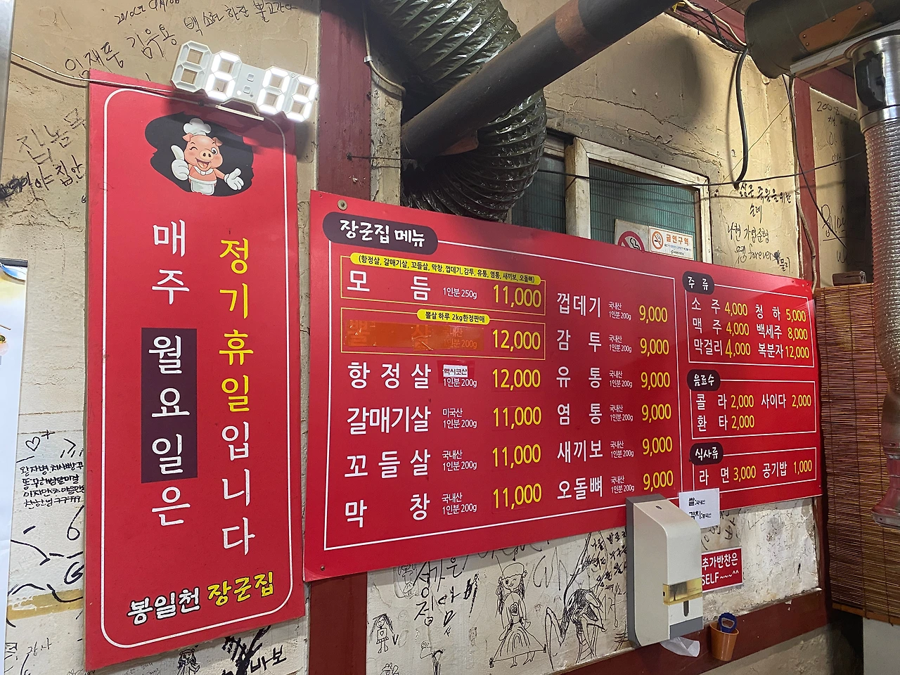 장군집의 메뉴판이다. 가격은 심히 저렴하다. 부속인 탓도 있을테지만, 그래도 다른 부속구이 대비 저렴한 가격. 라면이 3,000원이란 점도 놀라웠다. 괜히 동네 주민분들이 가득한 것이 아니었구나.