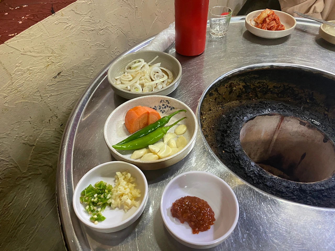 활활 타오르는 연탄불과 두 개의 은박이 세팅되었다. 하나는 소스+파절임으로. 버터가 들어간 하나는 김치를 넣어 풍미 한 가득 김치버터구이로 즐기면 된다. 없어선 안될 부속의 필수 조합이겠다.