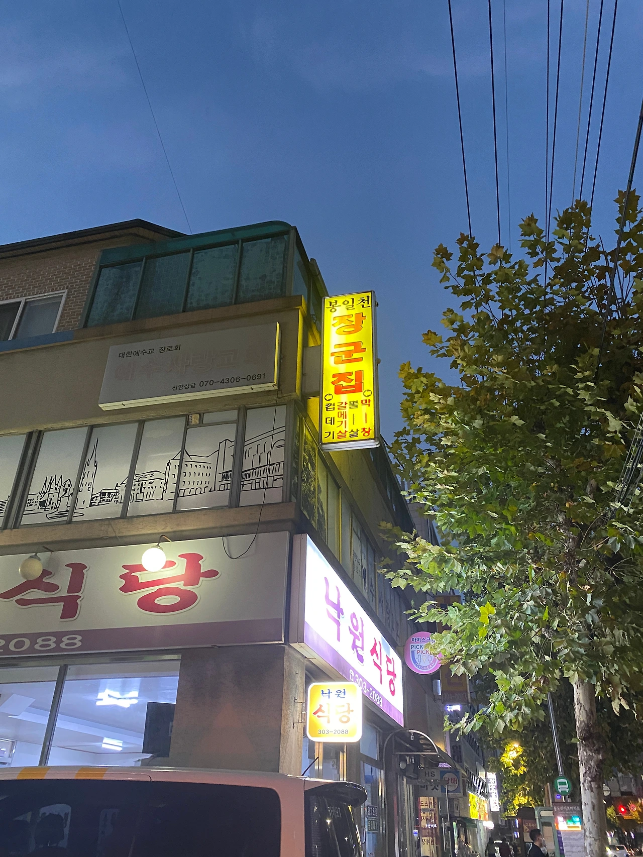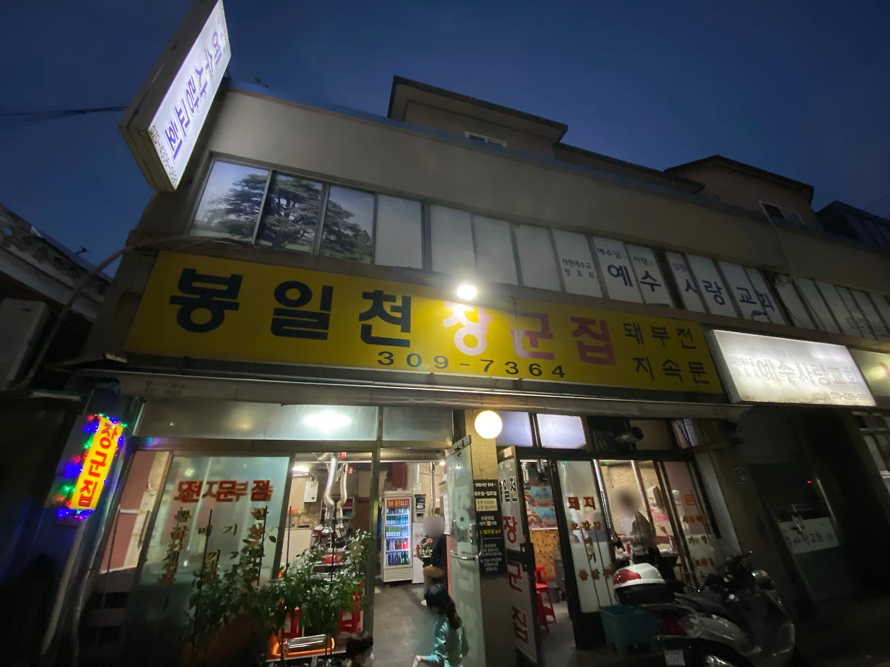 '봉일천 장군집'으로 향하는 길. 멀찌감치 노란 옆간판이 보이는데, 이름도 그렇고, 강렬한 노랑 빨강 조합으로 인해 흡사 점집처럼 보이기도 했다. 부속으로 유명한 봉일천에서 볼 수 있는 장군집 상호다.