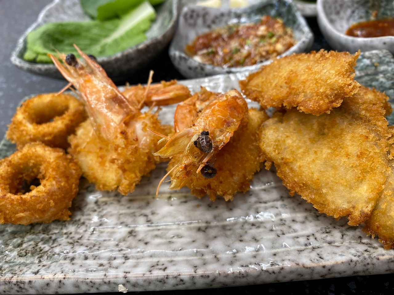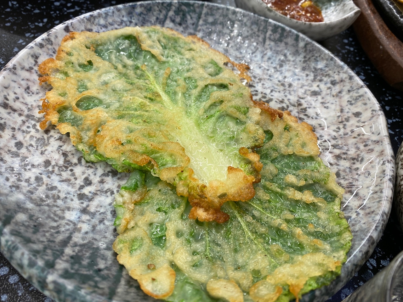 각종 튀김, 새우 및 오징어, 생선 튀김. 생선 튀김의 재료는 방어 같았다. 튀김 또한 기대 이상이었는데, 튀김옷에도 맛을 내기 위한 정성이 들어간 듯하다. 배추전과 마찬가지로 빠삭했고, 단순한 튀김 이상의 간과 맛이 느껴졌다.