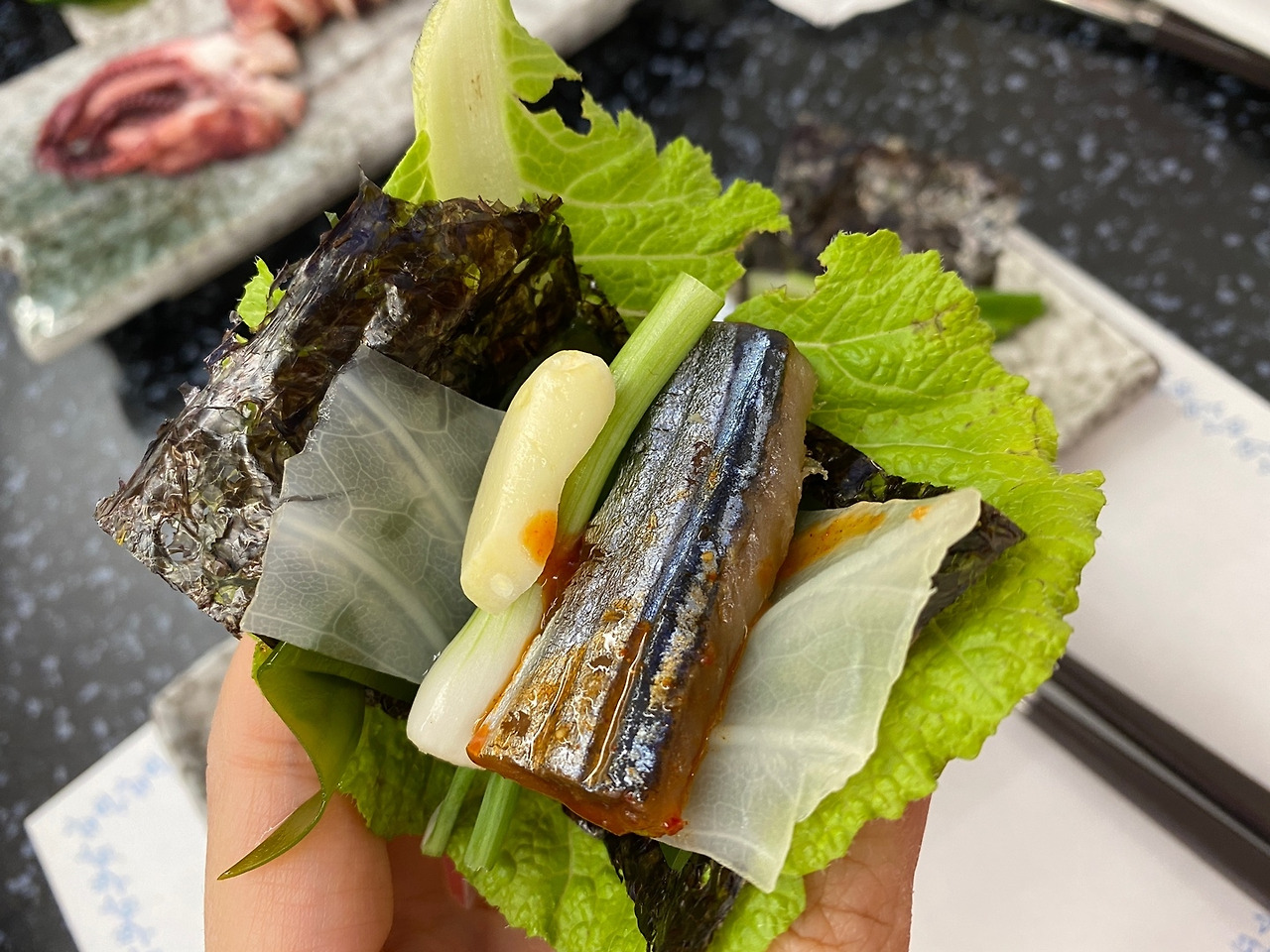 많이 이르지만 과메기 한쌈이다. 여기까진 평소와 다르지 않은 해산물 술상이지만, 이 다음부터 한입 한입에 감탄을 연발하게 만들었으니.
