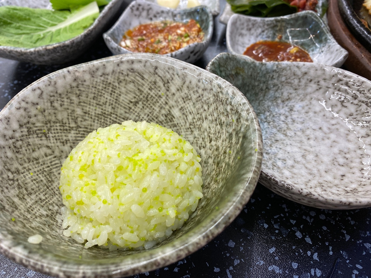 이쯤 되니 놀랍지도 않다. 메인 생선회에 곁들여 먹기 위한 초밥용 밥까지 나왔다. 알과 섞여 형광 녹빛을 띄는 것이 보기 또한 좋구나. 밥을 살짝 쥐어 와사비를 더한 후 광어 한 점, 간장 살짝 머금은 초생강 한 점 얹어서 한 입.