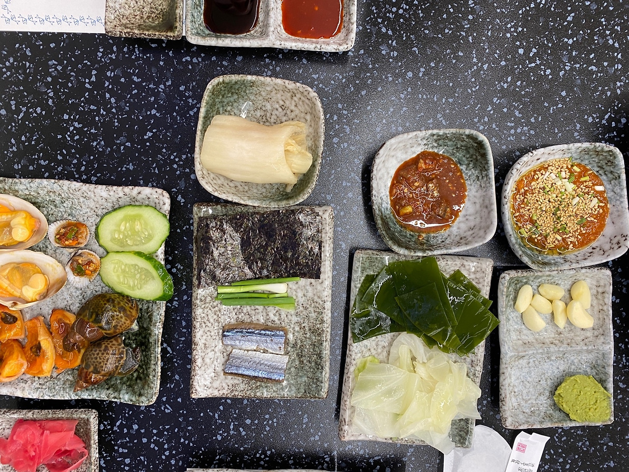 우선 하루의 마무리를 위한 코스의 첫 시작. 왼쪽부터 멍게, 바닷고둥, 꼬막과 과메기, 미역과 삶은 양배추 등이었다.