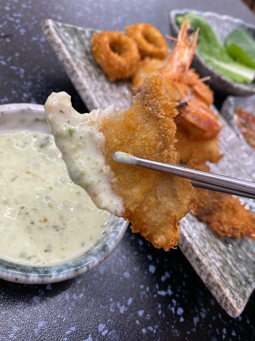 튀김 소스 또한 일품. 고추와 와사비 등을 섞은 타르타르 소스인 듯한데, 튀김을 즐기기에 아주 매력적인 소스다.