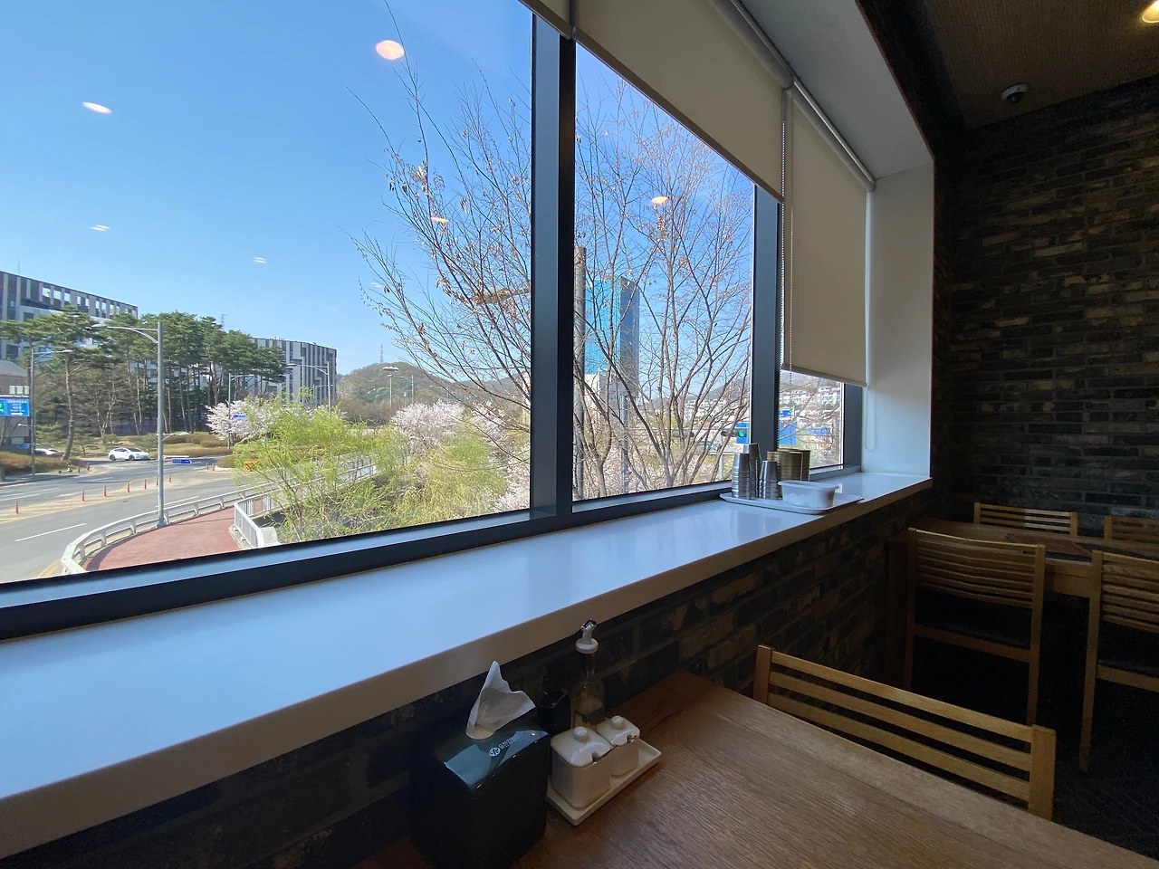 오늘은 저 바깥 봄 풍경을 반찬 삼아 평양냉면을 맛볼 예정. 창가 쪽에 자리를 잡아 앉고.