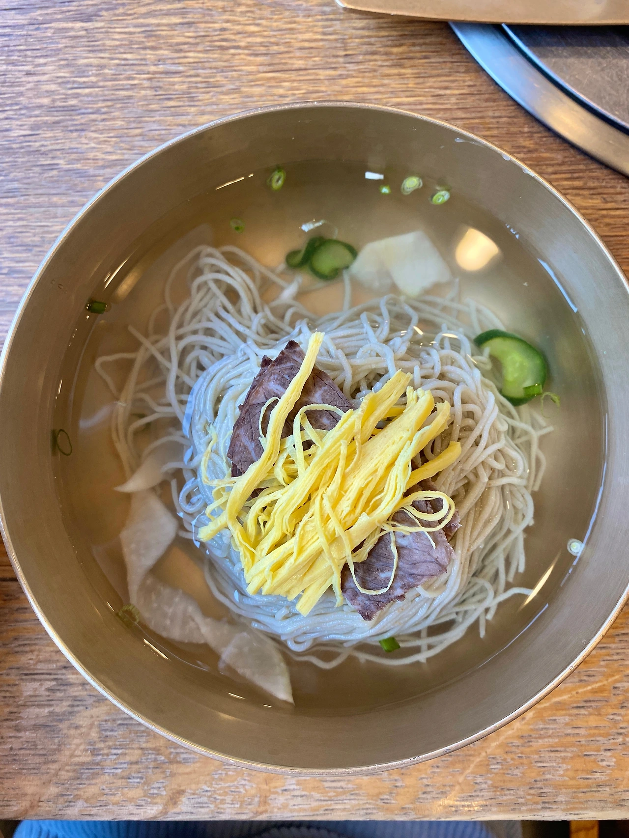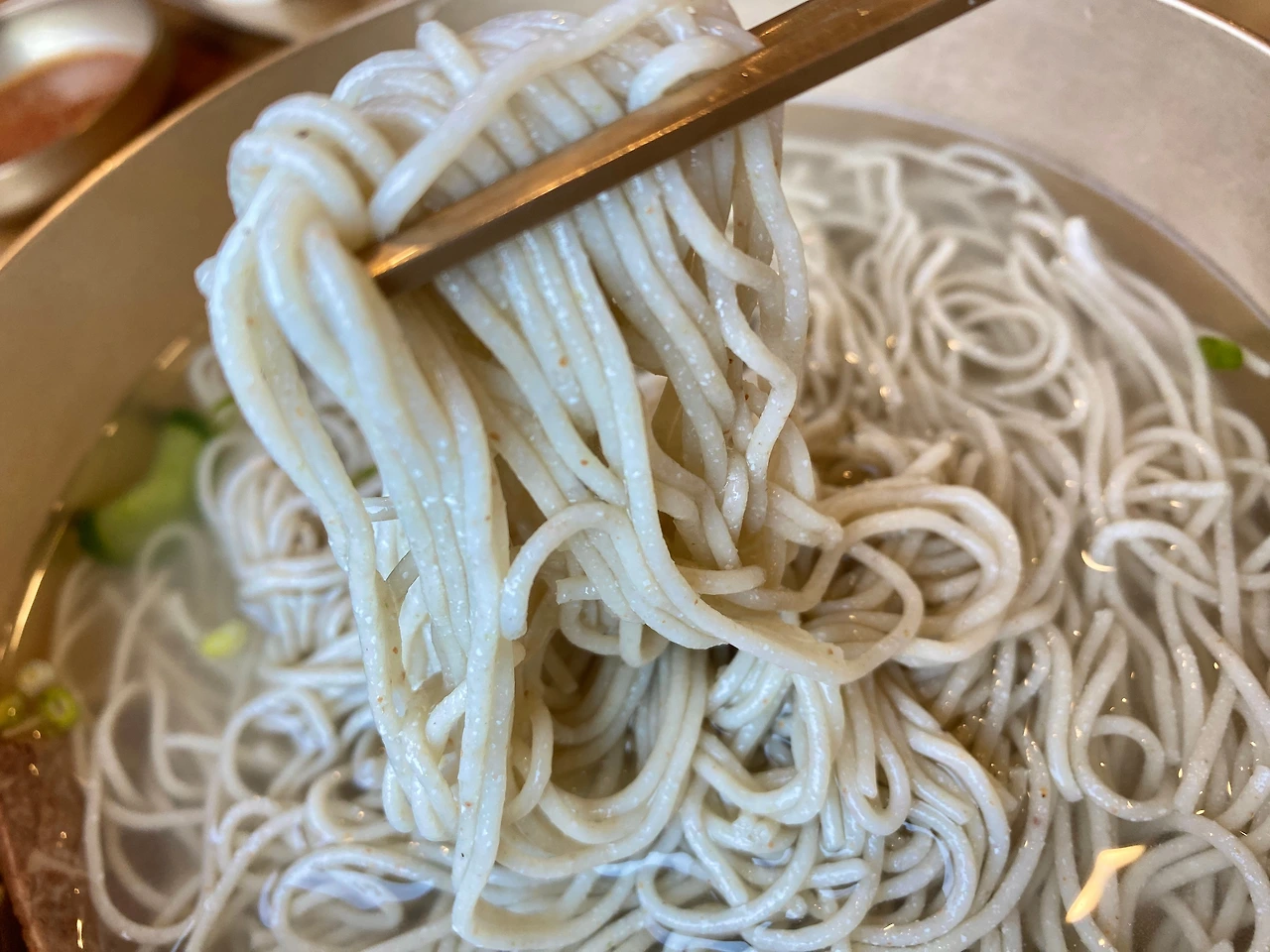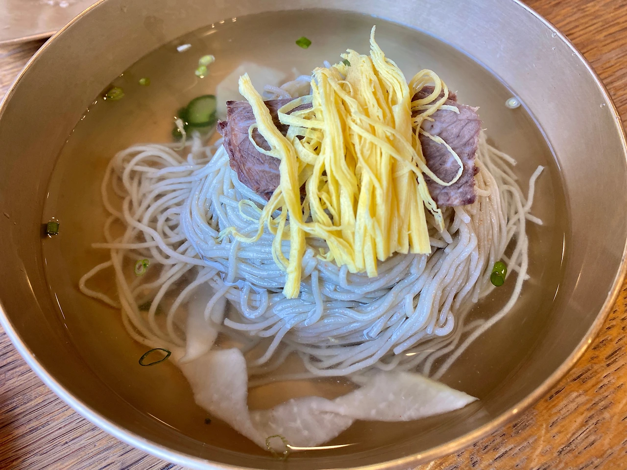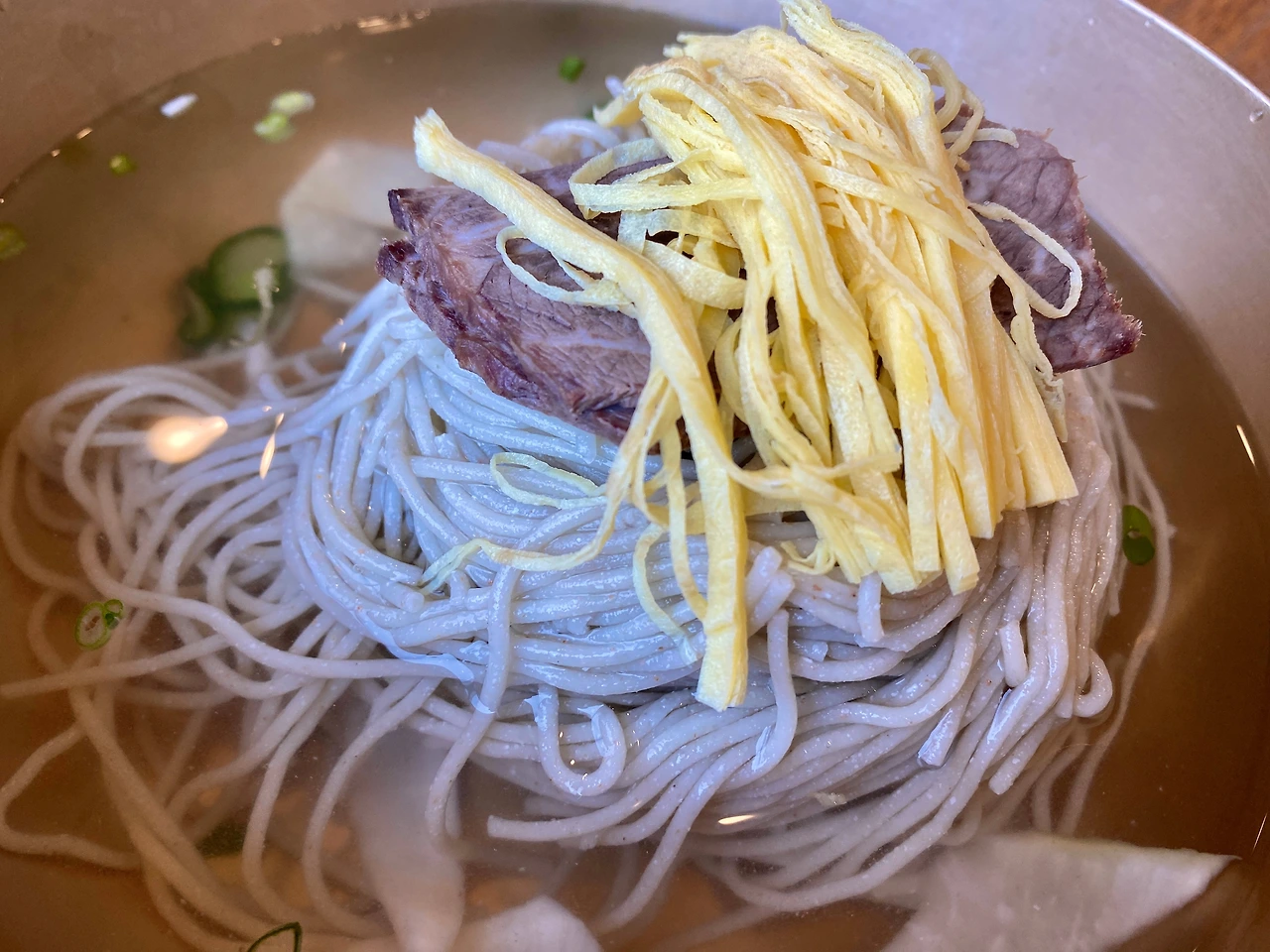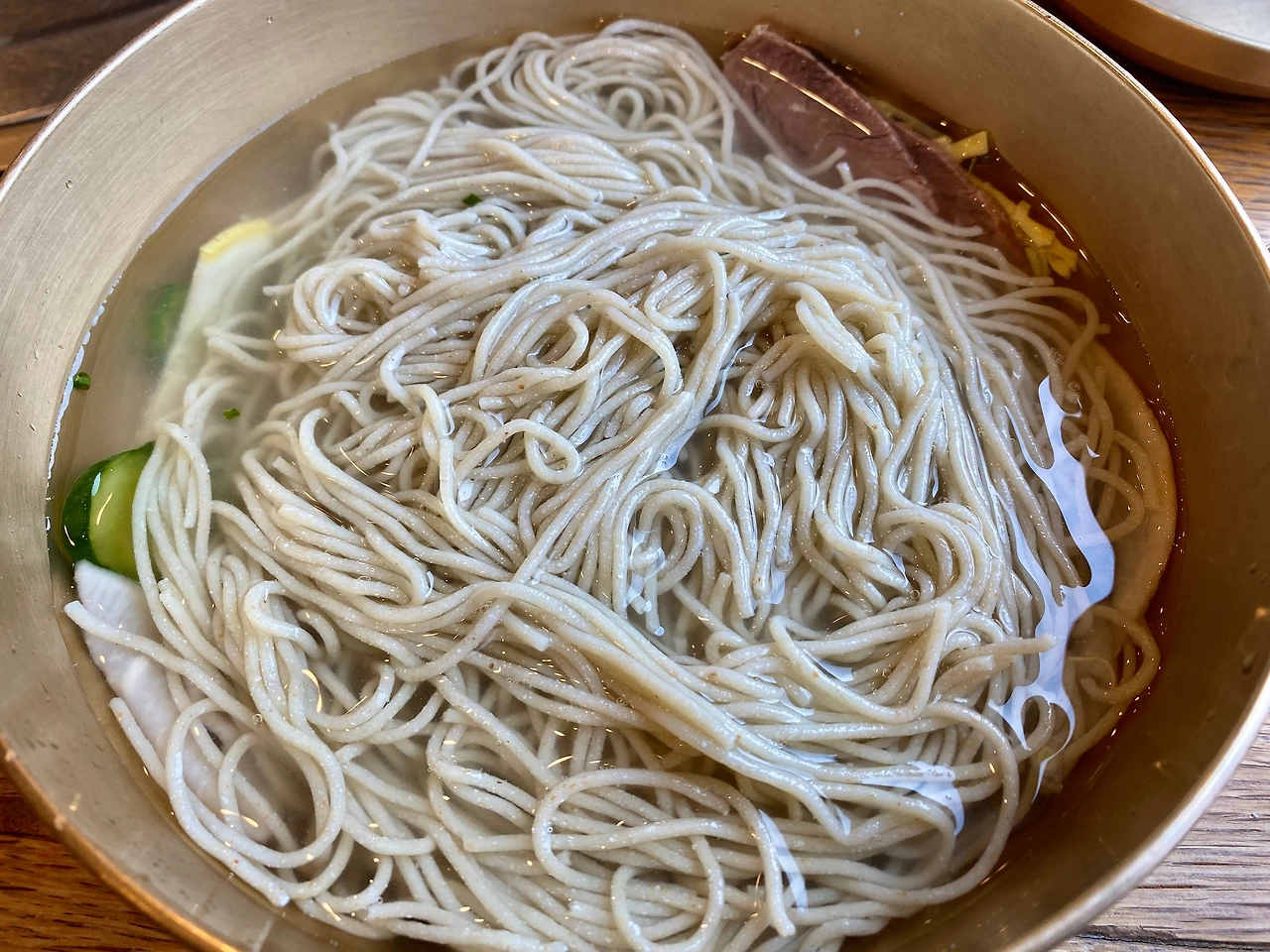 지체 없이 시원한 국물부터 한 모금. 음, 진한 소고기 육향. 좋구나. 필자의 경우 익숙한 소고기뭇국의 맛과 향이 쫘악 올라왔는데, 흔한 육향 진한 평양냉면임에도 '뭇국'과 같은 시원한 향도 돈다는 점에서 미세한 차이가 느껴졌다. 평양냉면 입문자들에게도 난이도가 높지 않을 맛, 더해 대중적인 맛일 수도 있겠구나.