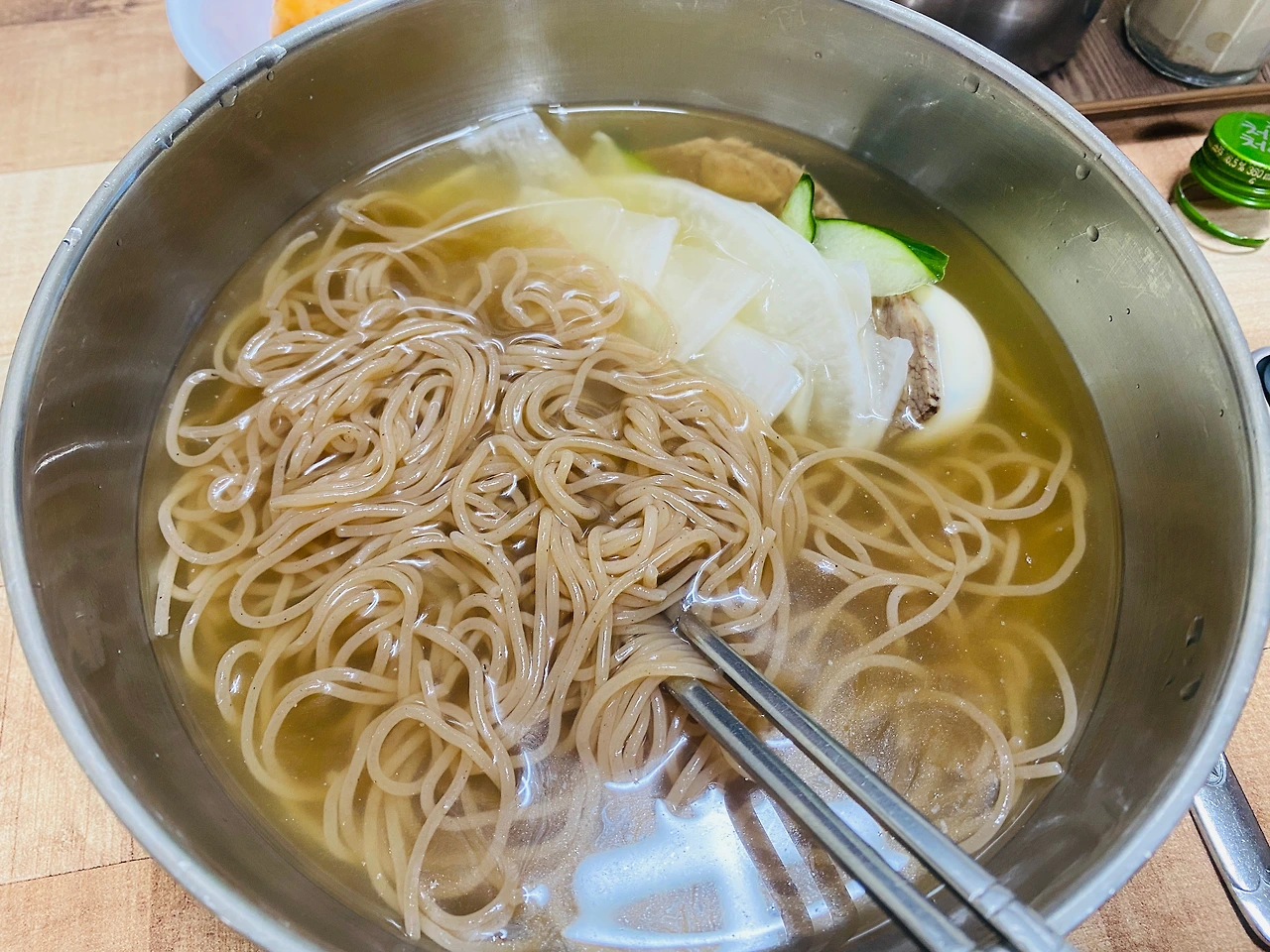 총 세 단계의 맛을 거치게 되는데, 사골 육수 → 사골 육수+메밀 면수 → 마지막엔 짠지와 같은 절여진 무가 간을 더해, 사골 육수+메밀 면수+동치미 의 느낌으로 맛을 음미할 수 있다. 참으로 오묘한 녀석이었다.