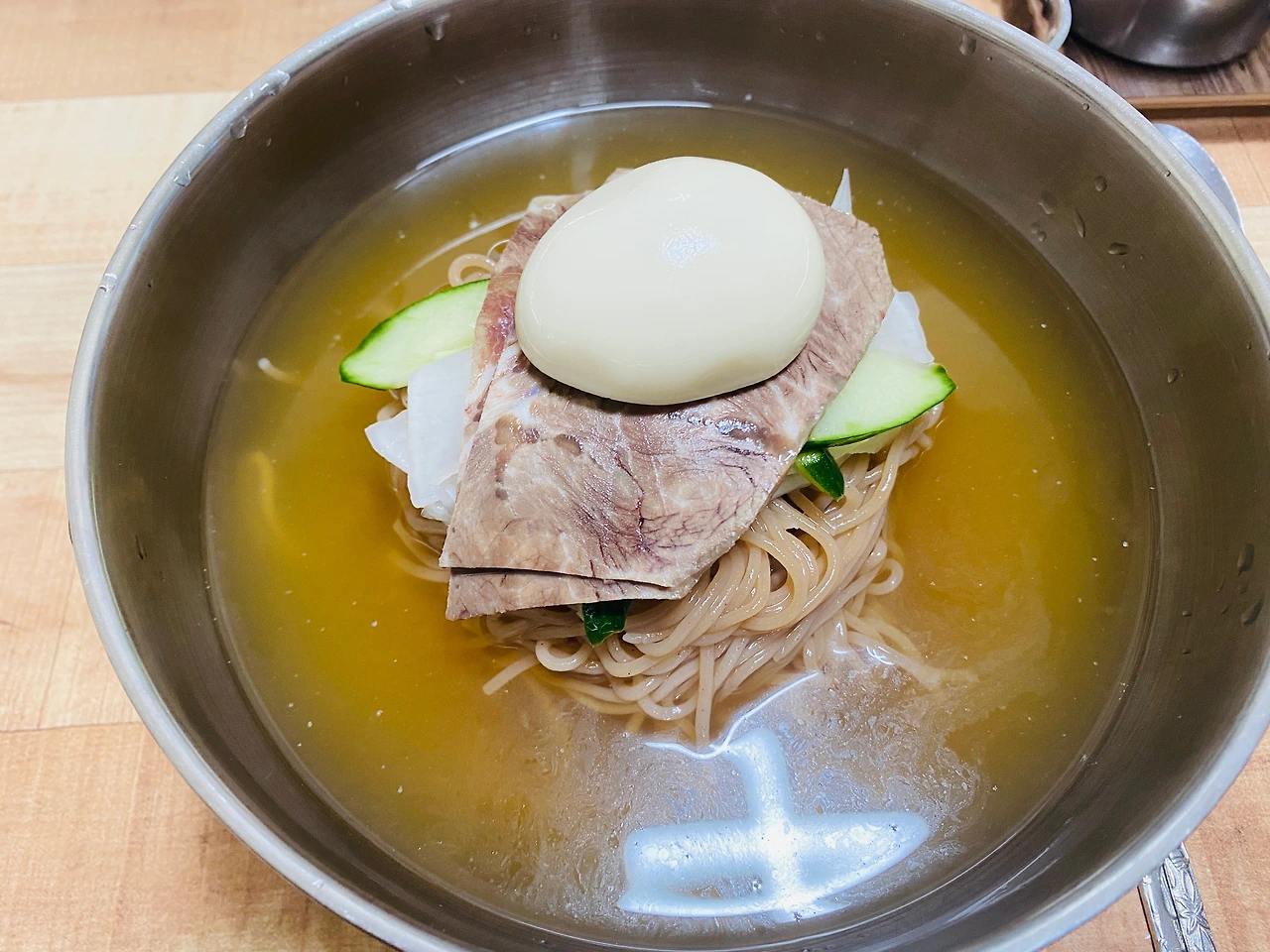 이후 등장한 유진식당 평양냉면이다. 진한 육수. 향이 강렬하다. 고기의 향. 맛을 보기도 전에 진한 설렁탕의 사골 육수 향이 난다. 우선 풀어짐 없이 국물만 살짝 음미. 굉장히 넘김의 끝에서 고기의 향이 강하게 도는 독특한 평양냉면이었다. 그리고 맛있다. 면을 풀기 전엔 설렁탕집스러운 육수의 향이 입안을 강하게 맴도는데, 냉면 맛만 보아도 좋은 육수 베이스의 국밥을 다루는 집이라고 추정될 정도.