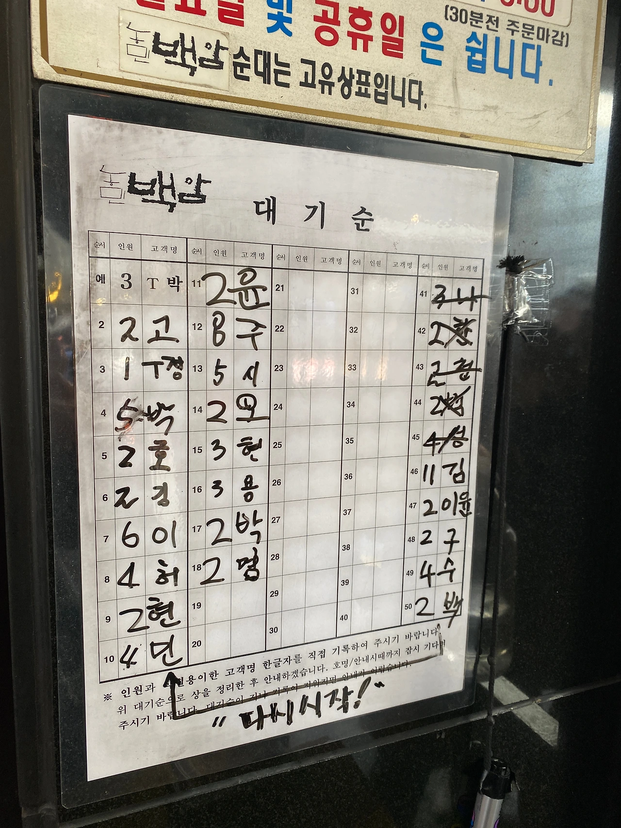그렇게 도착하자마자 입구에 인원과 약식의 고객명을 적으면 자리가 날 때 호명된다. 성이나 이름의 일부를 적는 듯한데, 막 적는 듯하다. 흔하지 않은 성씨들이 굉장히 난무하니 말이다.